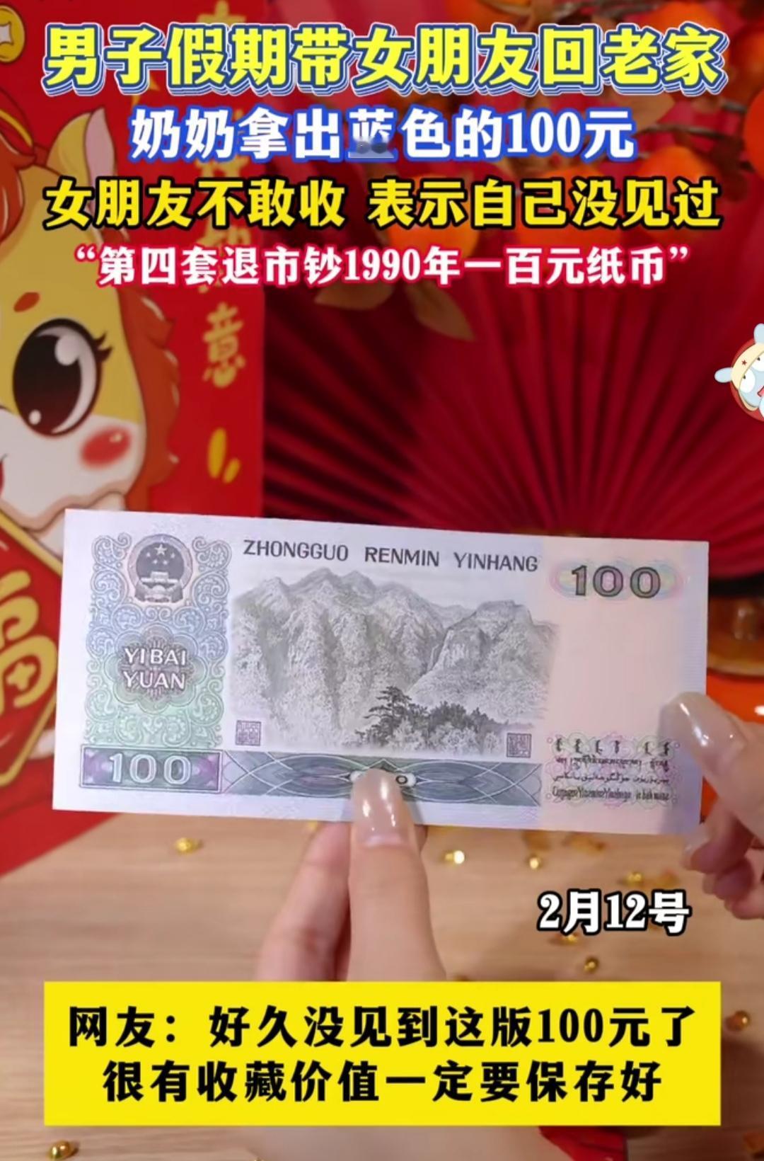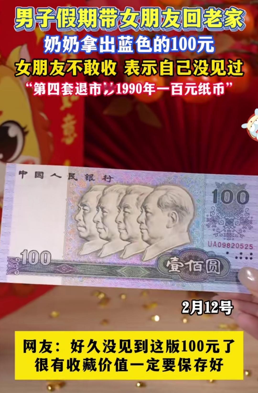 第一次带女朋友回农村老家,奶奶从压箱底的布包里,摸出一张蓝紫色的100元塞到她手里。姑娘攥着钱愣了半天,红着脸说:“奶奶,这钱我没见过,不敢收。” 这张印着四位伟人头像的纸币,是第四套人民币里的1990版100元,早已退出流通市场。对我们这代人来说,它是小时候攥在手心的“巨款”,是过年时最盼的压岁钱,是藏在衣柜最深处的安全感。 可在00后眼里,它更像一件带着时光温度的老物件。网友说,这钱有收藏价值,一定要好好保存。其实比价值更珍贵的,是奶奶藏了半辈子的心意,是两代人对“家”的不同记忆。
