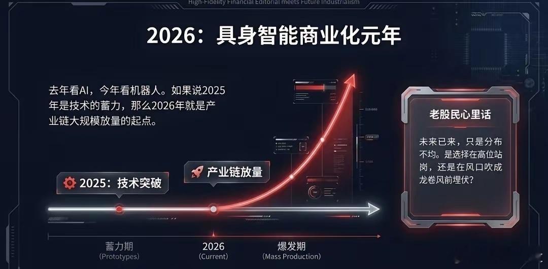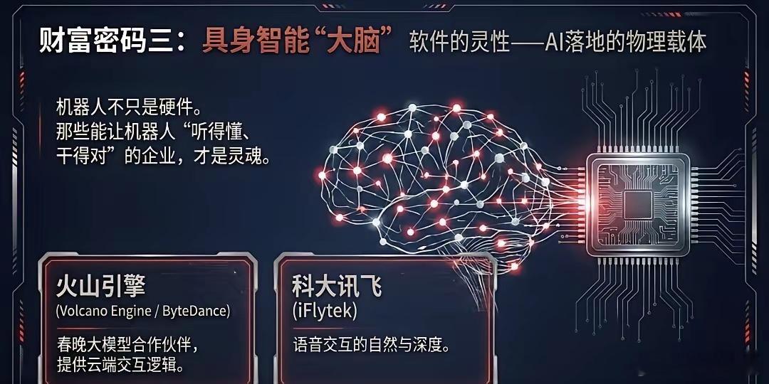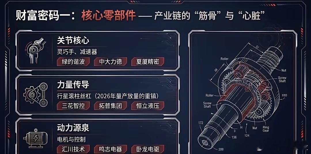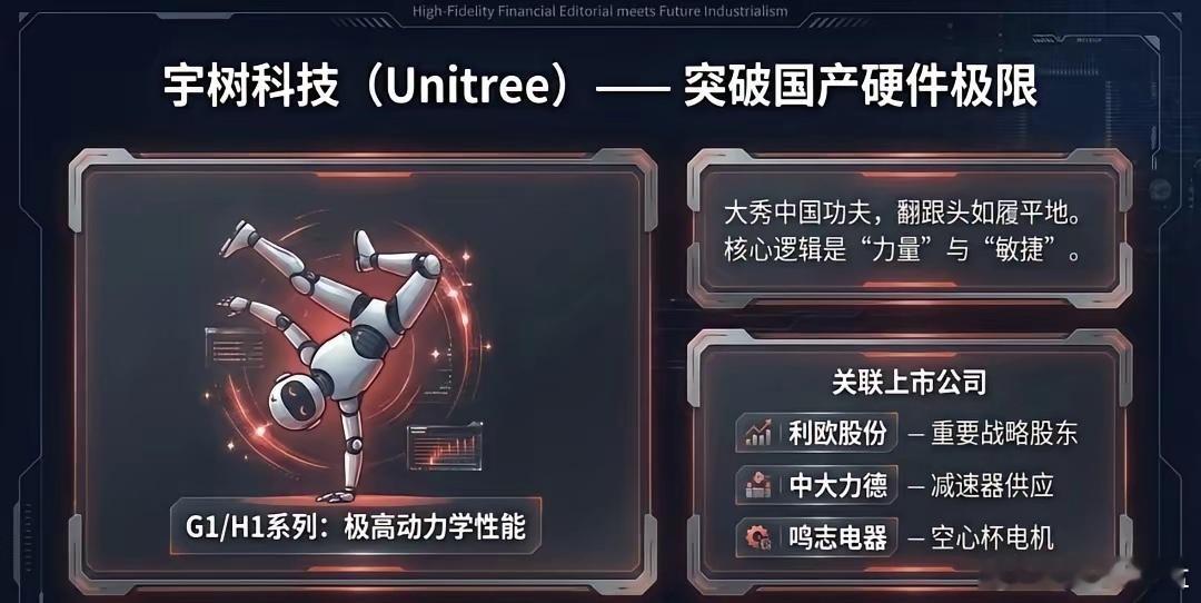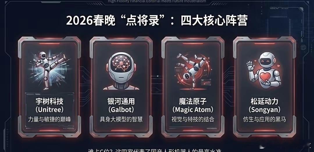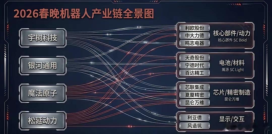 节后看这些一、 四大核心阵营(整机实力派)这4家是春晚上的C位,代表了当前国产人形机器人的最高技术水准及商业化进度。1️⃣宇树科技 (Unitree) —— 力量与敏捷的巅峰✅核心关联:利欧股份(重要战略股东)、中大力德(减速器供应)、鸣志电器(空心杯电机)🔍春晚表现:G1/H1系列人形机器人大秀中国功夫,展现了极高的动力学性能2️⃣银河通用 (Galbot) —— 具身大模型的智慧✅核心关联:天奇股份(合资设厂深度绑定)、宁德时代(动力电池与股权合作)、百达精工(千台级工业机器人订单落地)、兆丰股份(股权投资)🔍春晚表现:作为指定“具身大模型机器人”,展示了其在复杂场景下的自主决策与多模态交互3️⃣魔法原子 (Magic Atom) —— 视觉与特技的结合✅核心关联:芯联集成(战略入股及电驱控芯片)、夏厦精密(精密齿轮与丝杠)、昆仑万维(AI大模型支持)🔍春晚表现:开场表演“托马斯360°”特技,标志着高动态控制技术的成熟4️⃣松延动力 (Songyan Dynamics) —— 仿生与应用的黑马✅核心关联:利亚德(文旅场景合作)、风语筑(数字展陈合作)、慧辰股份(“小布米”系列大额订单)🔍春晚表现:主打情感交互与场景应用,展示了机器人走进千家万户的可能二、 核心零部件(产业链的“筋骨”)整机的光鲜,源于底层供应链的死磕。这是最应关注的、具有长效价值的“护城河”1️⃣执行器与减速器(关节的核心)绿的谐波、中大力德、夏厦精密:支撑起机器人流畅、精准的动作2️⃣行星滚柱丝杠(力量的传导)三花智控、拓普集团、恒立液压:实现高载荷直线运动的关键,也是2026年量产放量的重镇4️⃣电机与控制(动力的源泉)汇川技术、鸣志电器、卧龙电驱:提供高功率密度的核心驱动力5️⃣感知与视觉(五官的延伸)奥比中光、中科创达、芯联集成:让机器人“看见”并“理解”物理世界三、 算法与算力(时代的“大脑”)1️⃣火山引擎 (字节跳动/豆包):春晚大模型合作伙伴,为机器人提供云端交互逻辑2️⃣科大讯飞:分会场参演,展示语音交互的自然与深度2026是公认人形机器人元年。最强的逻辑往往不是靠一个明牌涨停,而是源于你对大趋势的深刻理解后,所获得的那份笃定与自由。