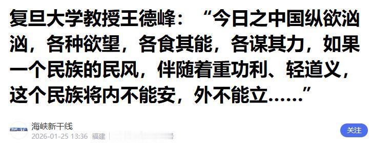 复旦大学教授王德峰,再次抛出惊人“言论”!他表示,今日之中国纵欲汹汹,各种欲望,各食其能,各谋其力,如果一个民族的民风,伴随着重功利、轻道义,这个民族将内不能安,外不能立……。字字诛心,振聋发聩! 这句话听着像一声闷雷,炸在人们心头。 放眼身边,谁不是在忙着奔生活? 街头巷尾贴的广告,都在教人怎么用最短的时间赚到最多的钱。 网络上铺天盖地的课程,讲的都是如何快速变现,如何打造人设,如何搞副业,如何搞钱。 年轻人聚在一起,常聊的不是爱好,也不是理想,而是工资多少,房买了没有,跳槽涨了几千。 谁都不想掉队,谁都想成功。 这原本没错,问题是太多人把所有的劲都往这条道上使,其他的东西就都靠边站了。 亲情、友情、邻里关系,有时候变成一种负担。 人和人之间的关系,变得像一场交易,讲的是得失,不是温情。 老人摔倒到底该不该扶,成了社会讨论的难题。 熟人之间胆子更大,假货、骗局、拉人头,坑的往往是信得过的人。 这些现象背后,是一种普遍的焦虑。 怕落后,怕失败,怕被看不起,怕一生平庸。 于是不断卷着,拼命追赶,心却越来越累。 有的人坚持不住了,干脆选择躺平,不争不抢,得过且过。 这样的社会氛围,表面是热闹的,实则是浮躁的。 王德峰说人活着图个牵挂。 爹妈惦记孩子,孩子惦记家,这种牵挂不是负担,是根。 可现在,很多人住进高楼,邻里之间互不相识。 老家的亲戚一年见不上几次,连名字都快叫不全了。 这不是进步,是丢了东西。 人活着不能只盯着工资条和房产证。 真要是这些出了问题,人就会慌,会没底。 物质永远是基础,不是全部。 心里要有个东西压着,那就是道义。 不然再多的钱,也换不来安心。 王教授说得没错,一个民族如果只盯着眼前利益,对外就没有信用,对内就没有秩序。 看看国际上,一些国家嘴上喊着全球责任,实际却拖欠联合国会费几十亿美元,连基本义务都不履行。 这种行为不是不小心,是故意为之。 说白了就是典型的重功利轻道义。 只顾自己那点小算盘,全球责任成了空话。 有的国家还在参拜军国主义神社,否认侵略历史,推行西方中心论。 这不是发展,是倒退。 他们拿利益做遮羞布,实则是在削弱自己国家的信誉。 当你一次次以利益为先,别人总有一天会看清你是谁。 没有道义的国家,靠不住,也站不稳。 反观中国,多年来从不拖欠国际义务,联合国会费按时足额交纳。 倡导人类命运共同体,推动多边合作,不是嘴上说说,而是拿行动证明。 这才是一个大国应有的样子。 在人工智能高速发展的今天,技术本身没问题,问题在于人怎么用。 如果只想着怎么赚钱,怎么打败对手,不考虑公平正义,那迟早出事。 技术越先进,越要有道义作为底线。 这就像大船下的压舱石,没有它,船走得越快,翻得也越快。 王德峰的书《寻觅意义》,讲的就是安顿内心。 不是不要追求,而是不要被追求绑架。 一个人要知道自己要什么,也要知道自己不要什么。 知足常乐不是让你躺平,是让你别被贪欲拖着走。 家和万事兴不是老话,是生活的真理。 把家里关系处好了,出门才有底气。 这不只是说给个人听的,也是说给整个社会听的。 国家要想走得稳,走得远,道义是必须的。 在国际上立得住,是因为内心有定力。 在国内稳得住,是因为人们彼此信任。 发展是硬道理,但发展的方向更是硬道理中的硬道理。 一味追求物质,忽略精神,迟早会出问题。 王教授的话不是反发展,是提醒我们别把发展的船开偏了。 一个民族,没有了信义、没有了牵挂、没有了规矩,就像盖在沙滩上的高楼,看着气派,一阵风就散了。 我们现在忙着奔跑,也要记得时不时问问自己,往哪儿跑,跑给谁看,图个啥。 能把这几个问题想明白了,才能活得不慌不躁,走得踏实长远。 参考资料:复旦大学教授王德峰,再次抛出惊人“言论”!--海峡新干线