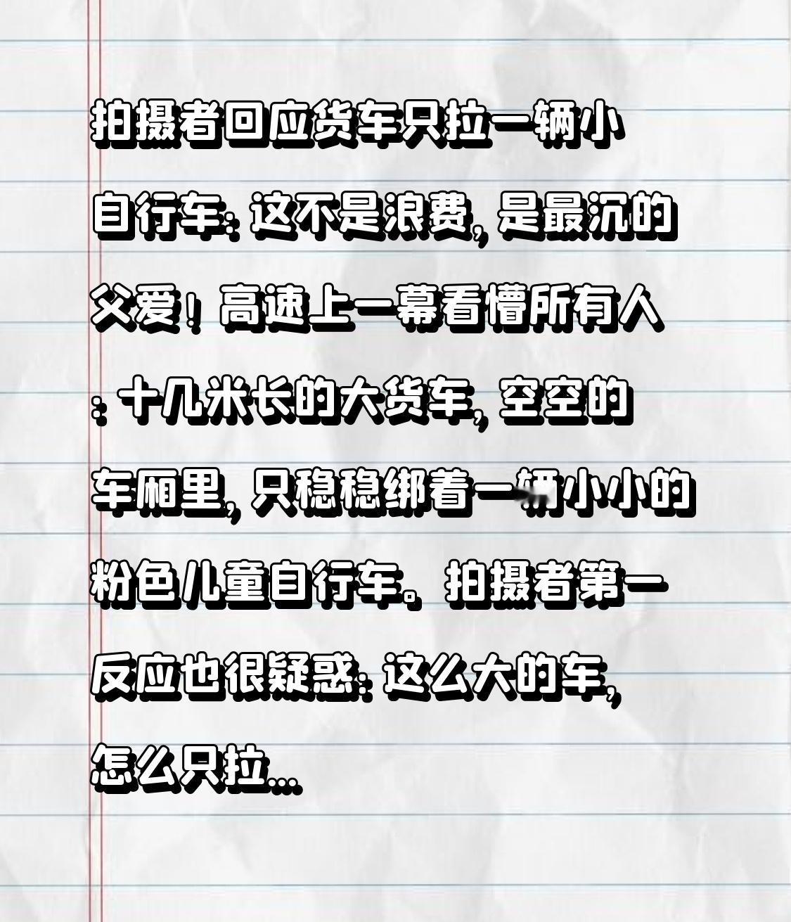 拍摄者回应货车只拉一辆小自行车:这不是浪费,是最沉的父爱! 高速上一幕看懵所有人:十几米长的大货车,空空的车厢里,只稳稳绑着一辆小小的粉色儿童自行车。拍摄者第一反应也很疑惑:这么大的车,怎么只拉这么小一辆车?可转念一想,瞬间破防,这背后的真相,看哭全网。 很多网友刚开始也不理解,觉得运费都比自行车贵,这也太不划算、太浪费了。有人猜是天价限量款,有人说司机任性,可谁也没往最暖的地方想。直到拍摄者说出心里话:这肯定是货车司机,过年回家给孩子带的新年礼物啊! 转折就在这一瞬间。我们总用成本和效率衡量一切,却忘了最珍贵的东西,从来不能用金钱计算。这位货车司机常年跑运输,一年到头在外奔波,错过孩子的成长,亏欠太多陪伴。他怕快递暴力磕碰,怕礼物不够完美,宁愿空车返乡,用整辆大车“专车护送”,把这份心意平平安安送到孩子面前。 车厢很大,能装几十吨货物,可在这位父亲心里,这辆小小的自行车,比任何货物都重。这不是浪费运力,是跨越山海的承诺;不是任性之举,是藏在细节里的父爱。他用最笨拙的方式,给孩子最踏实的惊喜,告诉孩子:爸爸再忙,也把你的心愿放在心上。 拍摄者的回应,没有华丽的语言,却道出了最朴素的温暖。这世上最动人的风景,不是高楼大厦,不是山珍海味,而是普通人藏在烟火里的深情。每一个在外打拼的父母,都在拼尽全力,把最好的留给孩子;每一份小小的心愿,都值得被用心守护。 这辆货车,拉着最轻的礼物,却载着最重的爱。它不仅载着一辆自行车,更载着团圆的期盼,载着一个父亲的温柔。愿每一份父爱都被看见,每一个孩子都能被温柔以待,愿所有奔波在外的人,都能平安回家,与家人温暖相拥。