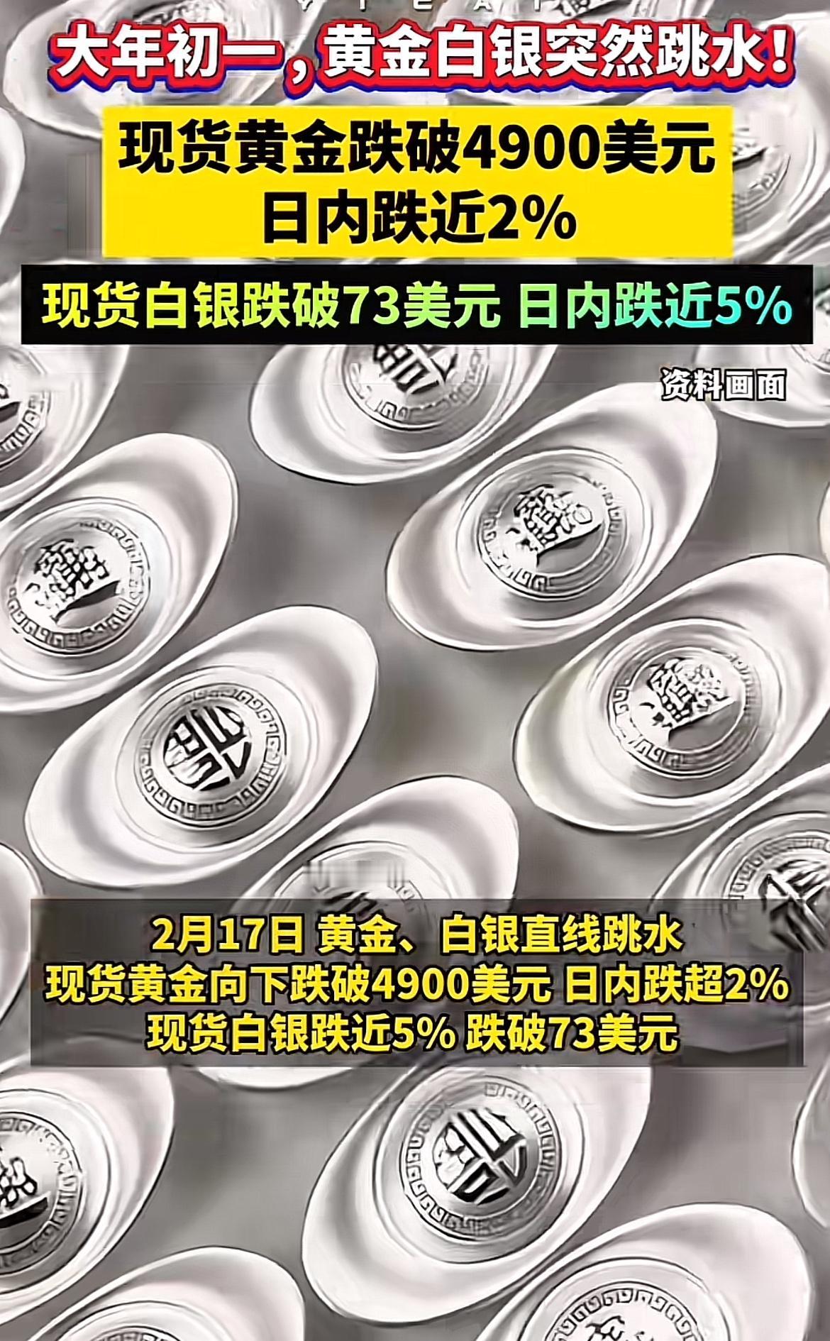 2月17日,黄金白银价格大跳水,现货黄金跌破4900美元,日内跌超2%,现货白银跌近5%,跌破73美元。这波下跌主要是因为美联储降息预期降温,黄金在5000美元关键关口遇阻,部分投资者获利了结。 美国股市回归后面临压力,三大股指期货盘前普跌。市场情绪疲弱受地缘政治和科技股调整等因素影响。大家都在关注ADP就业数据、美联储会议纪要和GDP初值,想从中找利率政策转向线索。目前市场预期6月降息概率高,今年预计降息约59个基点。资金流向也有变化,国债需求上升,对冲基金大量涌入亚洲市场。