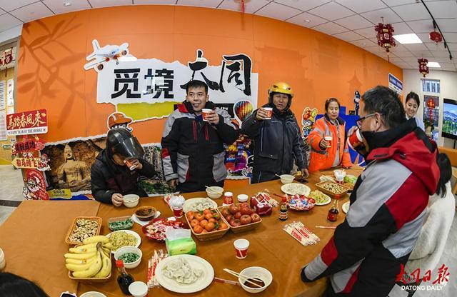 “今天准备了200斤的面和饺子馅,因为户外工作者越是过年越辛苦,我们布置得有年味点,让大家吃上热乎饺子、感受家的温暖。”户外驿站工作人员介绍,他们早在半个月前就开始准备食材,除了饺子,还准备了凉菜、水果、干果和饮料等,一应俱全。