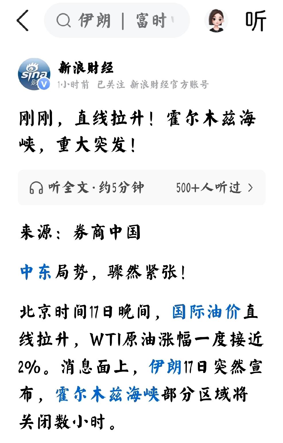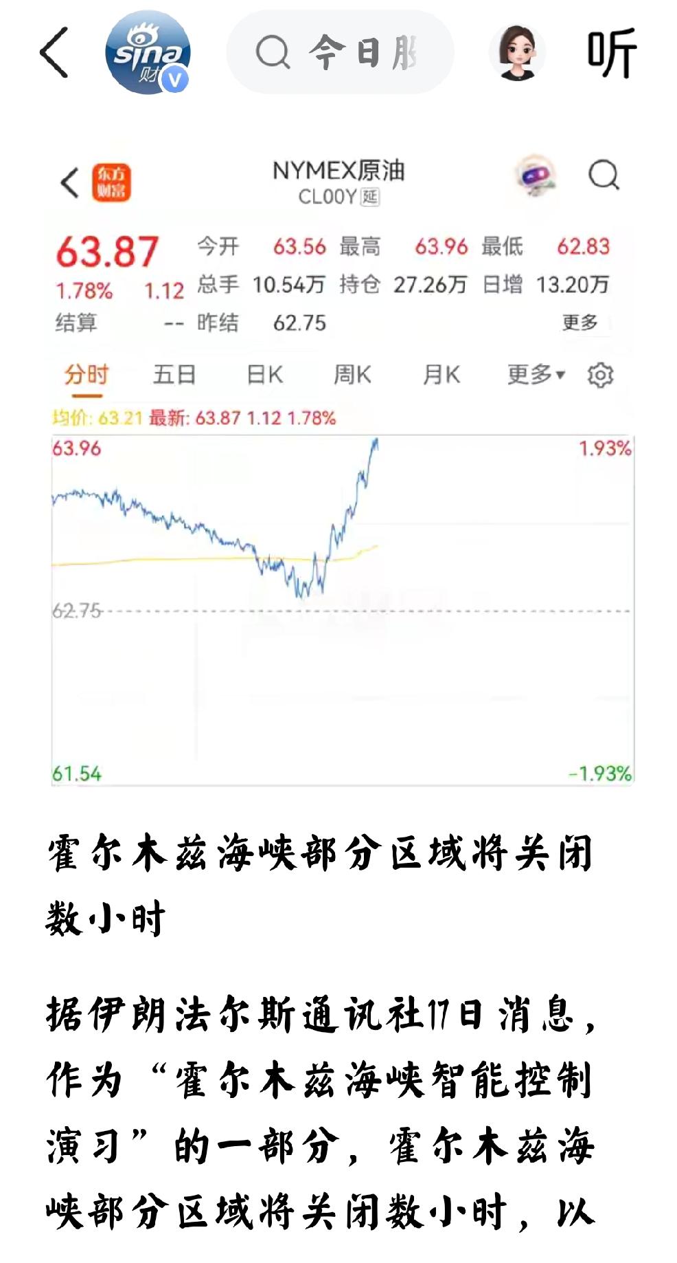 2月17号,新华社快讯发文:“美伊间接谈判结束” 同时17日晚,国际油价直线拉升。 据伊朗法尔斯通讯社:伊朗宣布霍尔木兹海峡部分区域,将关闭数小时。 个人认为:美伊斗争已经开始。 外交方面,国际油价,国际航运,3个互相联系的方面,同时出现罕见的举措,这分明就是在说:美国和伊朗的斗争已经到了白热化,公开化的程度。 美国终于下定决心要与伊朗开战了。 个人认为,这次美国将遭遇史无前例的失败,并且影响美国的全球战略,同时美国必患有“消化不良的症状”。