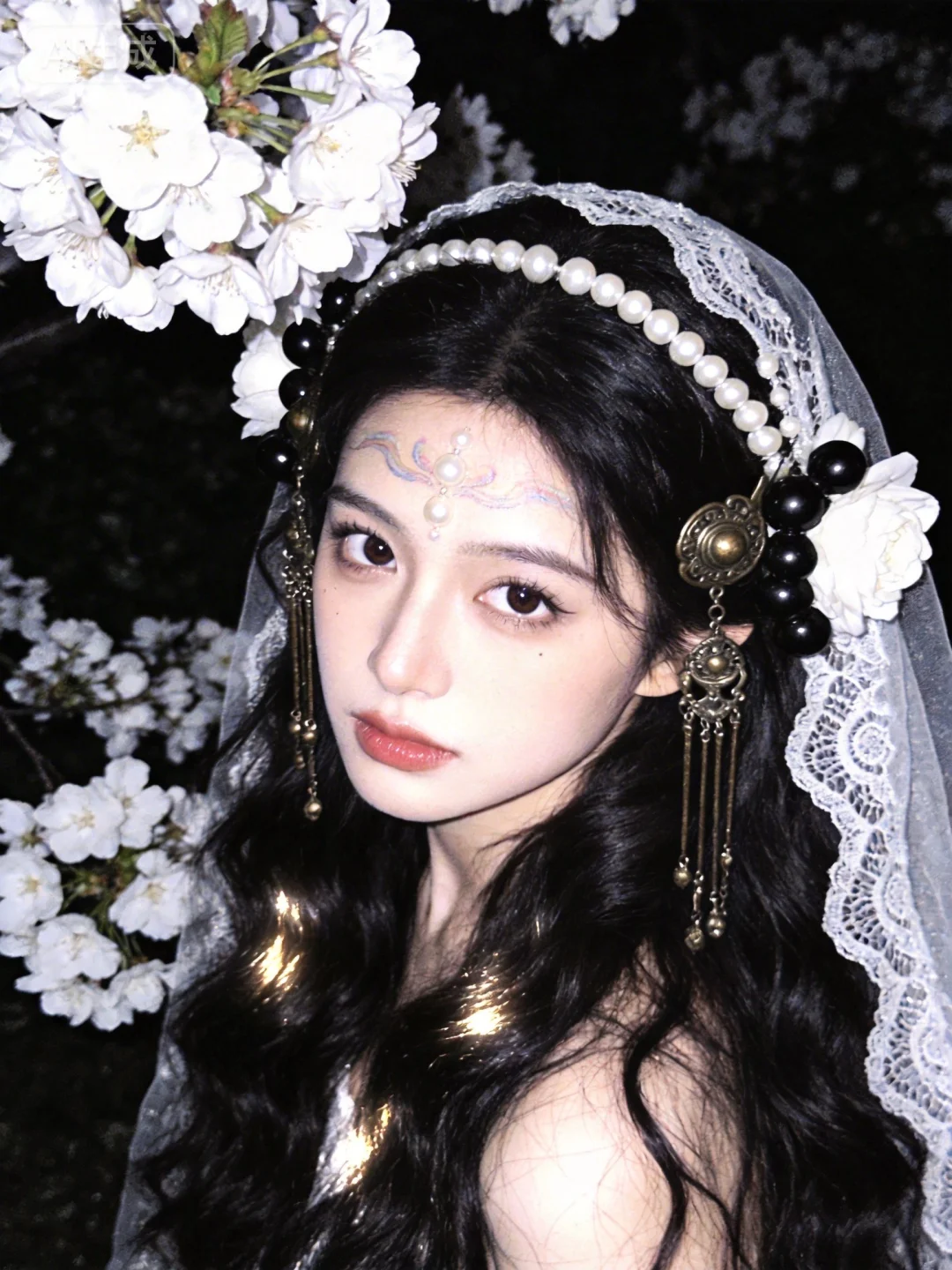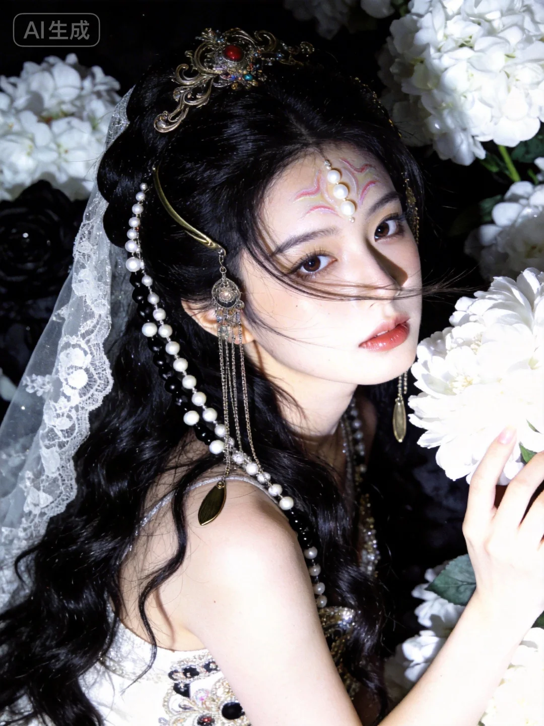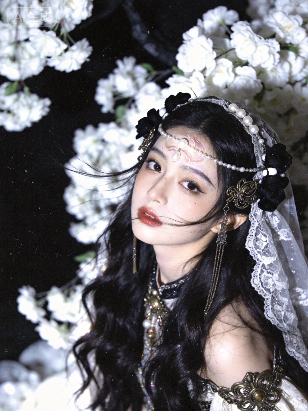 美少女,冷白皮,美艳动人,黑色波浪卷长发到腰。装扮为神秘风造型(蕾丝头纱+黑白珍珠配饰+白色花艺),具艺术张力;互动姿态(花艺互动的艺术造型,具艺术大片感)