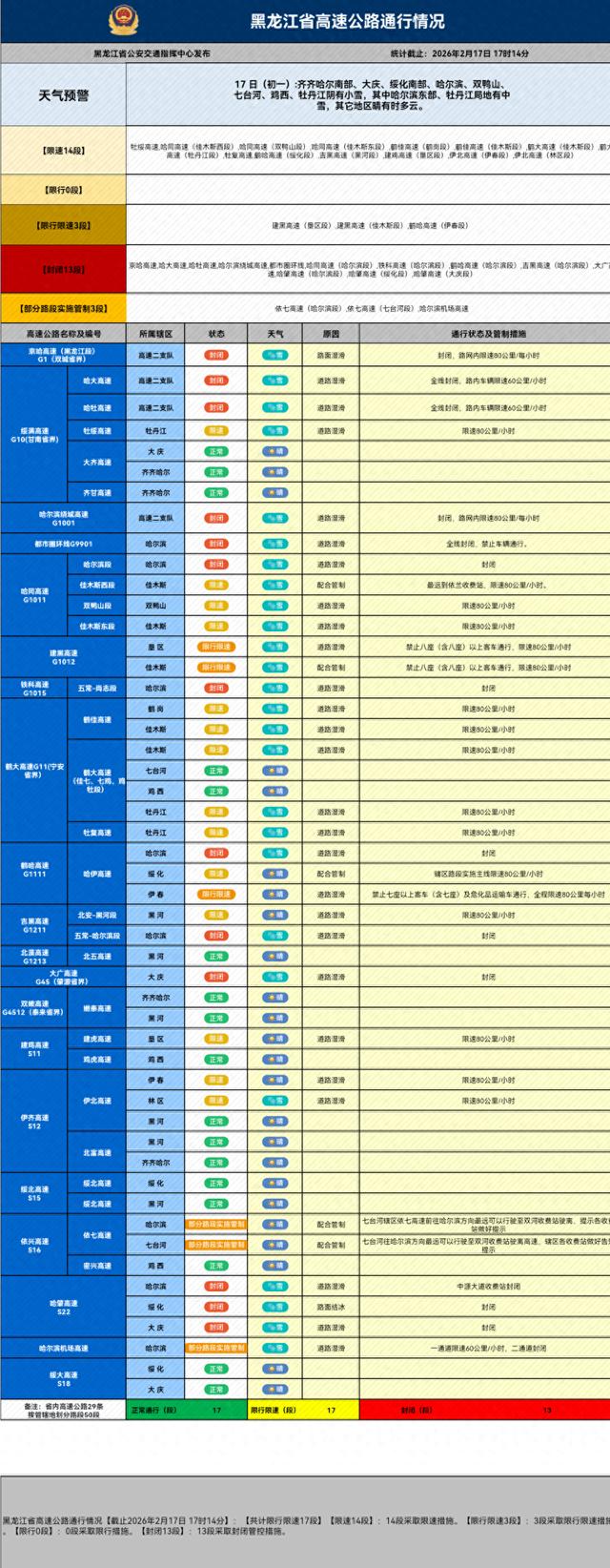 17日,记者从黑龙江省公安厅交通管理总队高速交管部门获悉,受省内降雪影响,截至17时14分,全线封闭的高速有13段;限行限速17段(限速14段,限行限速3段);省内17段高速路况正常。