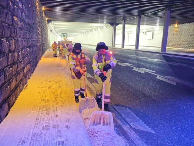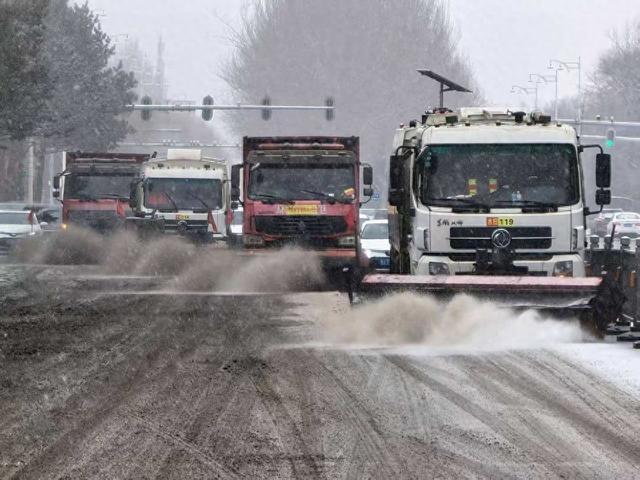 降雪开始后,各区城管部门迅速行动,人机协同高效作业:出动吹风机清理人行道、公交站台、过街天桥等区域积雪;滚刷车编组对主干街路、坡路、桥涵、交通节点巡回清刷。