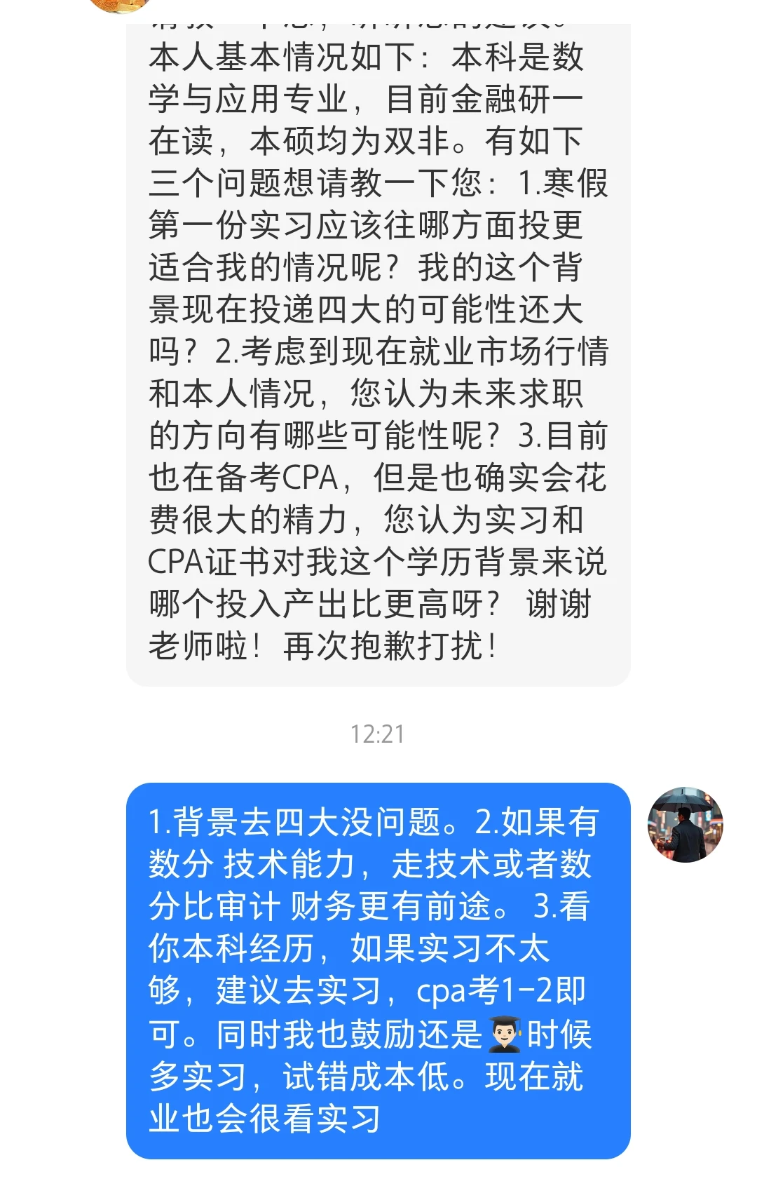 老师您好!很抱歉冒昧打扰,目前遇到了一些有关实习和未来求职规划等方面的困惑,想请教一下您,听听您的建议。本人基本情况如下:本科是数学与应用专业,目前金融研一在读,本硕均为双非。有如下三个问题想请教一下您:1.寒假第一份实习应该往哪方面投更适合我的情况呢?我的这个背景现在投递四大的可能性还大吗?2.考虑到现在就业市场行情和本人情况,您认为未来求职的方向有哪些可能性呢?3.目前也在备考CPA,但是也确实会花费很大的精力,您认为实习和CPA证书对我这个学历背景来说哪个投入产出比更高呀? 谢谢老师啦!再次抱歉打扰!