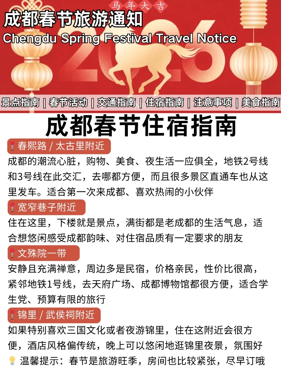 ▪️住宿可以选:春熙路(市中心方便)、宽窄巷子(老成都味浓)、文殊院(性价比高)。