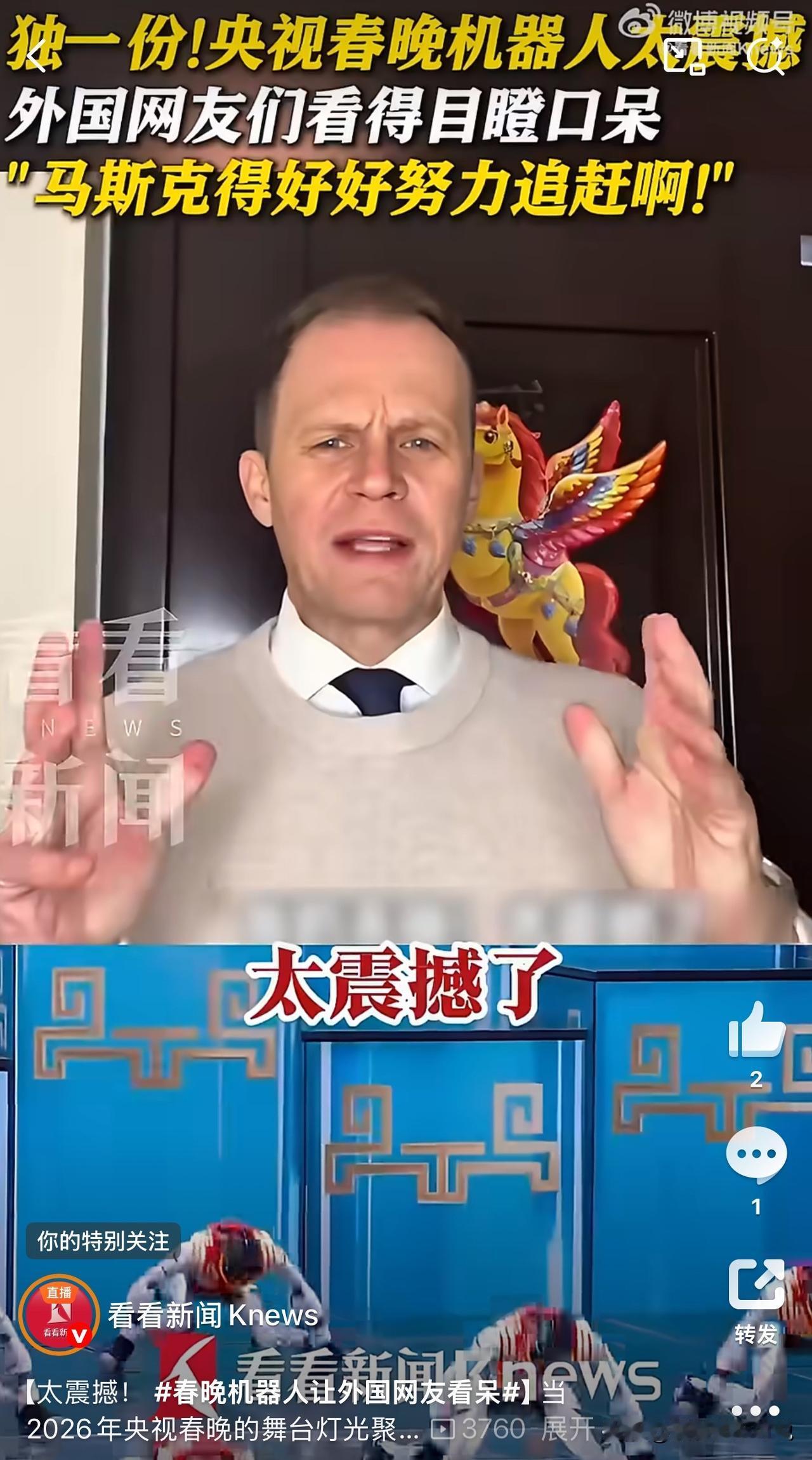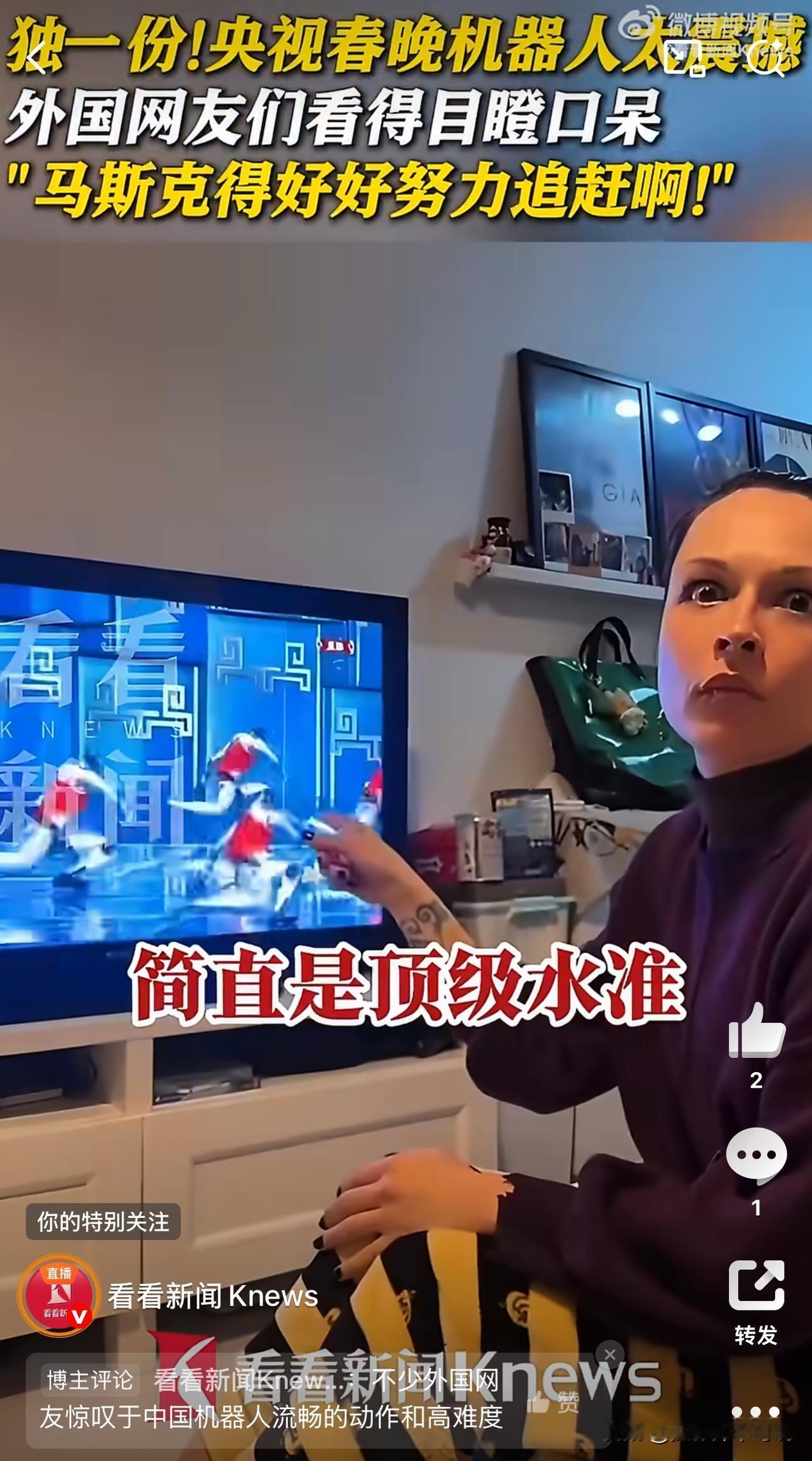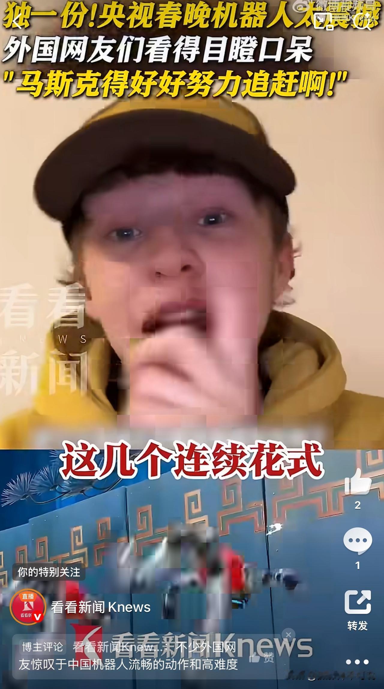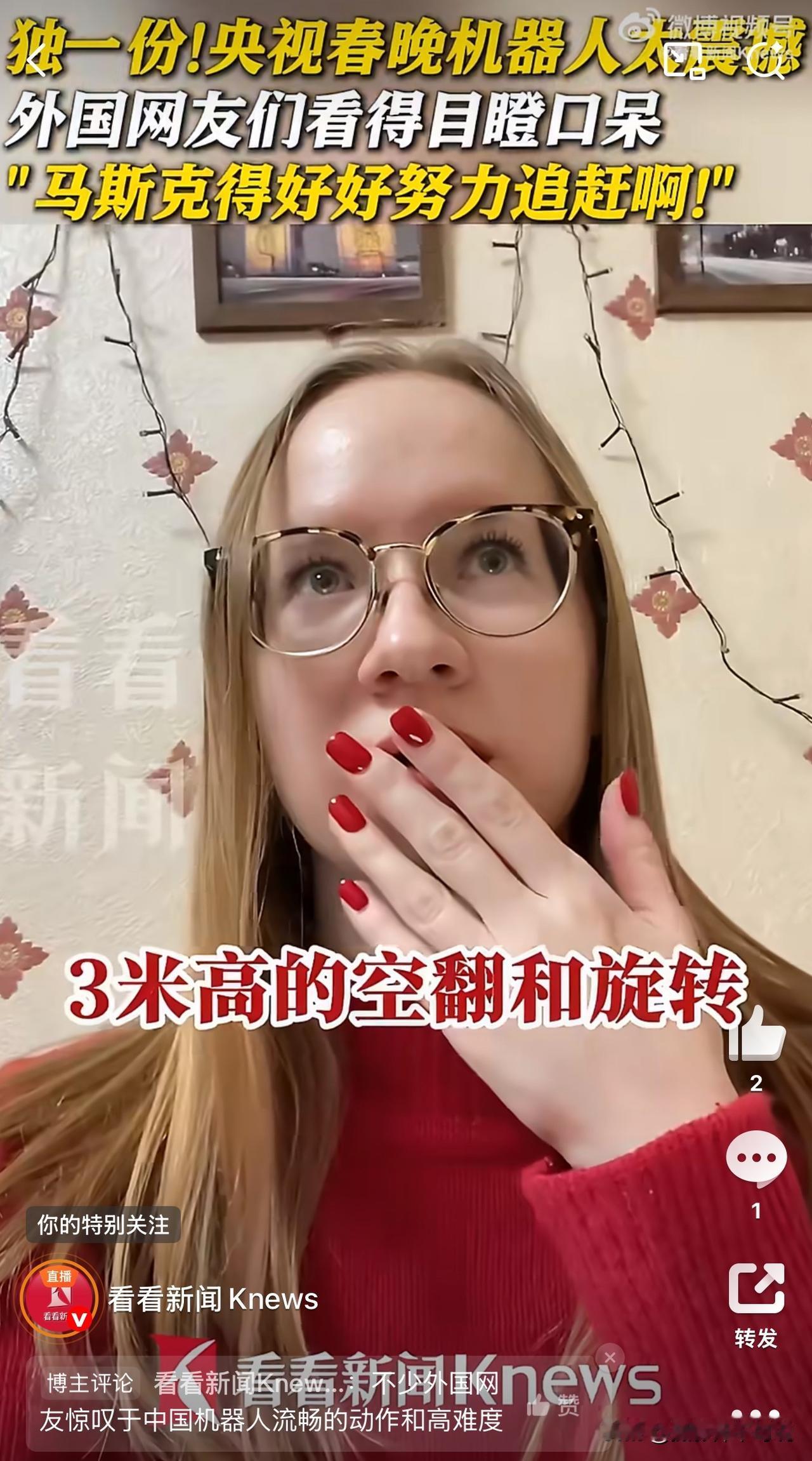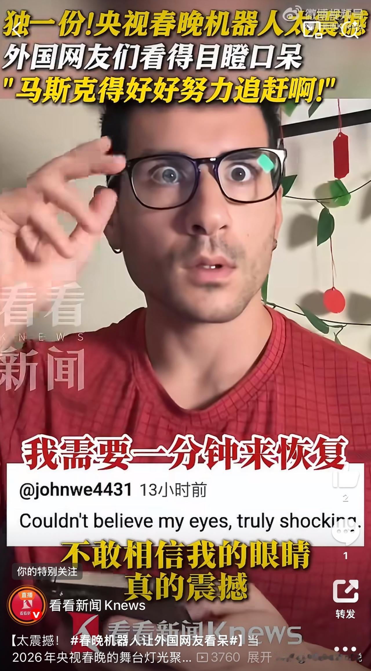外国网友看春晚机器人武BOT的反应亮了,一个个表情夸张得让人咂舌!大家都知道,老外与人交流时喜欢声情并茂,看起来十分具有感染力!随着今年春晚的全球传播以及我国影响力越来越大,看我国春晚的外国人也越来越多。当老外看到机器人武术表演时,一个个表情就十分丰富了,看起来有种目瞪口呆的既视感!想想也是,当我们家在看到这段表演时也是感叹连连,更何况老外了!有鉴于此,我完全有理由相信,明年春晚上的机器人表演将会让他们更加的震撼和惊讶!记录我的2026