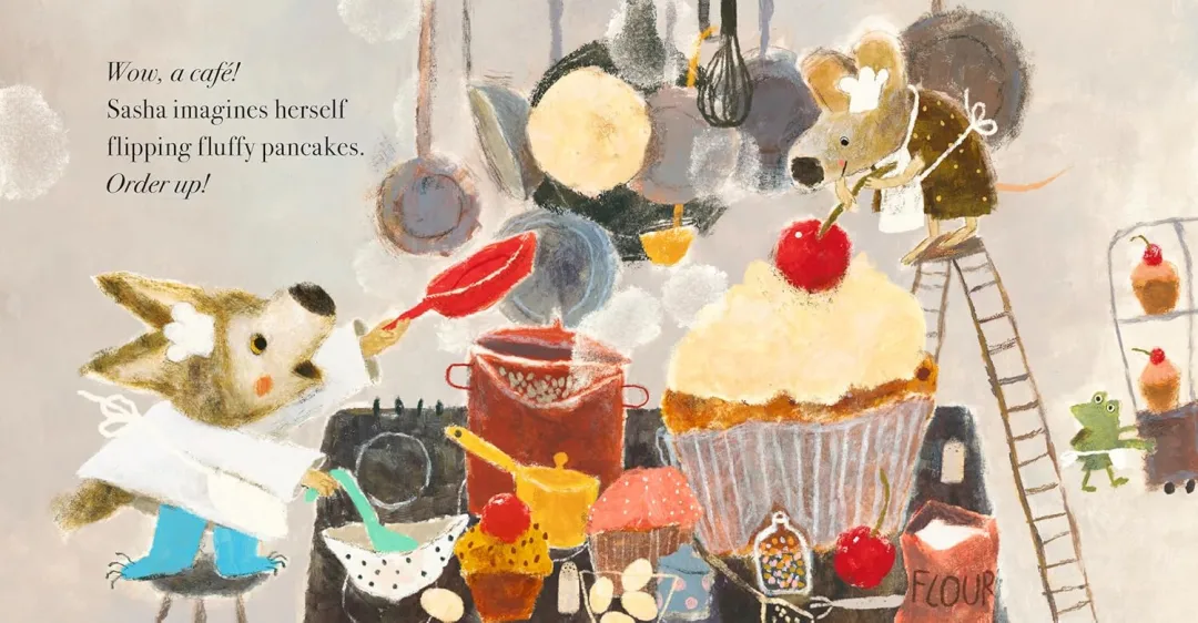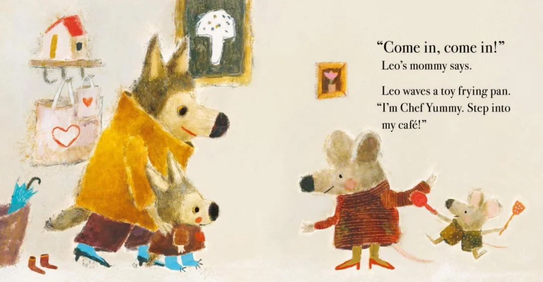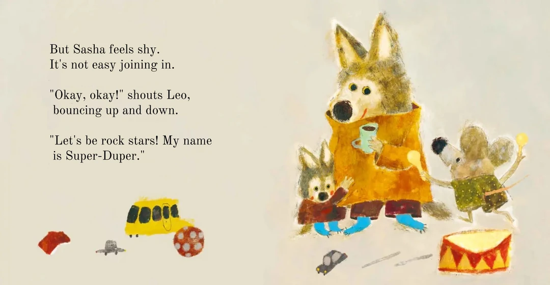 里欧热情邀请她一起扮大厨、开餐厅, 沙沙只是躲在妈妈身后,没有响应; 里欧又提议当摇滚巨星,或玩航天员游戏, 虽然沙沙脑中浮现好多好多有趣的画面, 心里很想加入,可害羞总让她退缩,