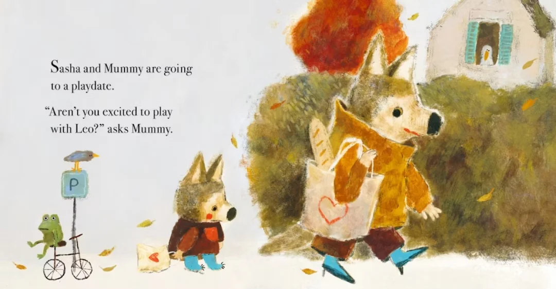 今天小狼沙沙要和妈妈去小狮子里欧家玩, 她却一点也高兴不起来。