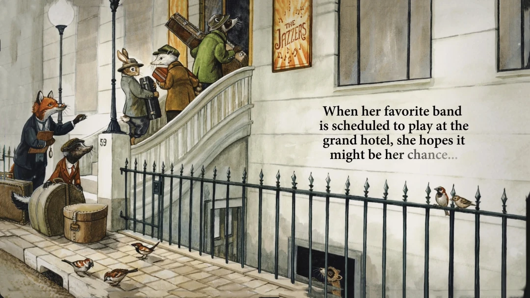 主角 Flora 是一只在酒店做底层洗碗工的雪貂,她最大的梦想是听一场音乐会,为此攒下每一分钱。当她发现最爱的爵士乐队 “The Jazzers” 在自己工作的酒店演出时,不顾一切想去聆听,却被经理嘲讽:“音乐不属于你这样的人。”