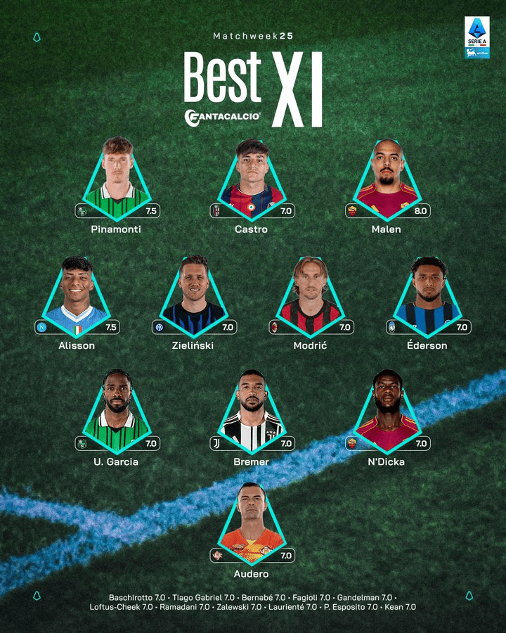 意甲第25轮最佳阵容(3-4-3)