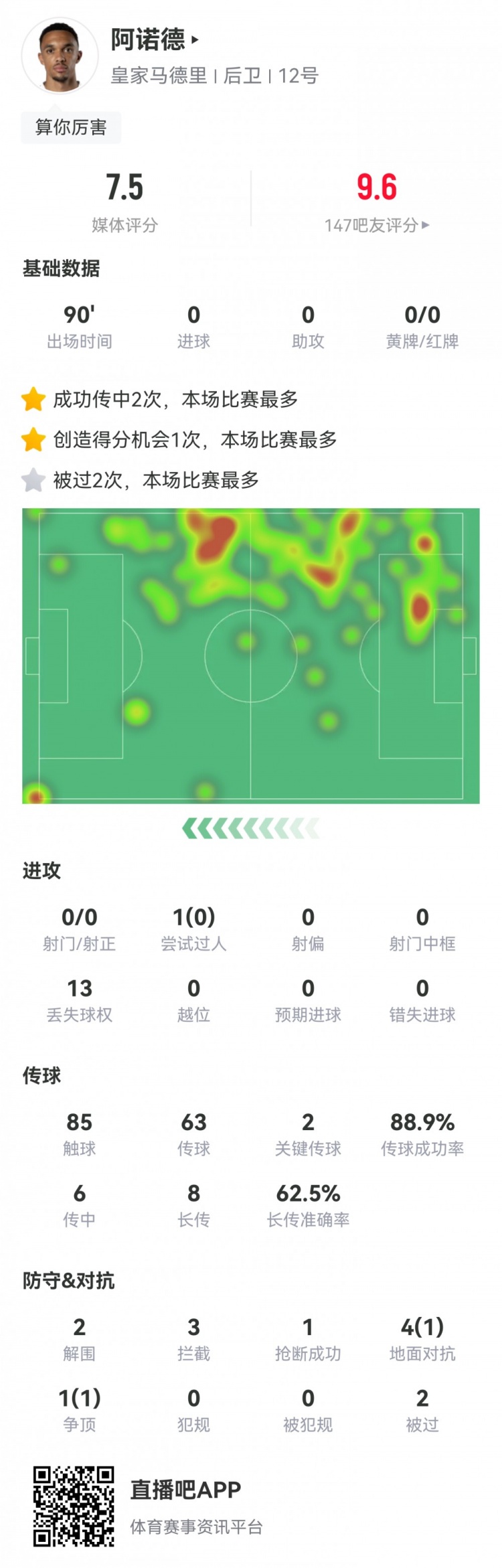 直播吧2月18日讯欧冠淘汰赛附加赛首回合,皇马1-0本菲卡。此役阿诺德首发打满全场,球员全场重点数据如下↓