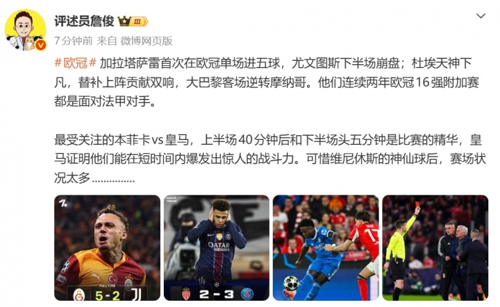 加拉塔萨雷首次在欧冠单场进五球,尤文图斯下半场崩盘;杜埃天神下凡,替补上阵贡献双响,大巴黎客场逆转摩纳哥。他们连续两年欧冠16强附加赛都是面对法甲对手。