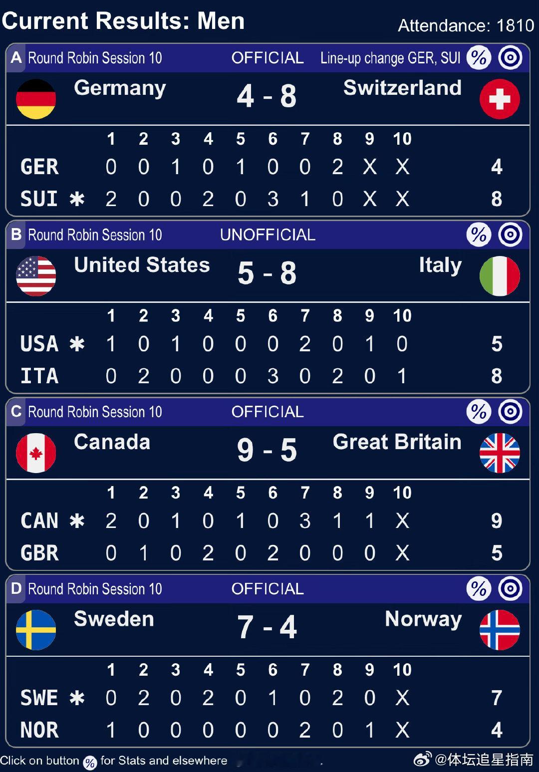 冰壶派 【正在进行】2026年米兰科尔蒂纳冬奥会米兰冬奥会冰壶冰壶男子循环赛第10轮战报:🇩🇪德国4-8🇨🇭瑞士,🇺🇸美国5-8🇮🇹意大利,🇨🇦加拿大9-5🇬🇧英国,🇸🇪瑞典7-4🇳🇴挪威。本轮比赛中国队轮休。中国队下场比赛将在北京时间2月18日21:05对阵捷克队。 cr:冰壶派