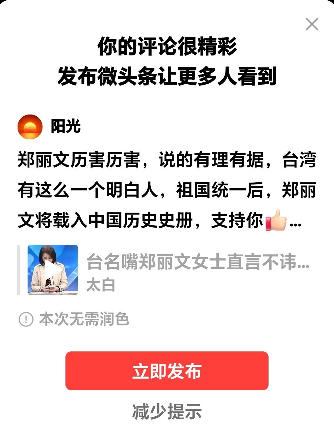 郑丽文为了祖国的统一,讲的太棒了,快来看看吧! 微头条 郑丽文历害历害,说的有理有据,台湾有这么一个明白人,祖国统一后,郑丽文将载入中国历史史册,支持你[赞][赞][赞] 请看《台名嘴郑丽文女士直言不讳说湾湾,说的太好了!》。台湾人民有这么一个强汉的领导人,能让台湾人民知道回归大陆的好处,今后的生活会财源滚滚、幸福安乐!支持她的人定会越来越多,希望就在眼前!!!