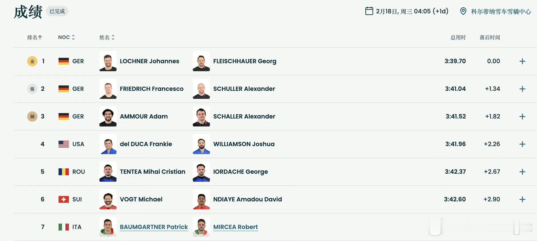 2026米兰冬奥会男子双人雪车赛事收官,🇩🇪德国队包揽该项目金银铜牌。🇨🇳中国组合孙楷智 / 安泰、李纯键 / 叶杰龙分别以 3分44秒17、3分44秒59 的总成绩完赛,两对选手均大幅刷新该项目中国冬奥历史最佳战绩,实现新突破。