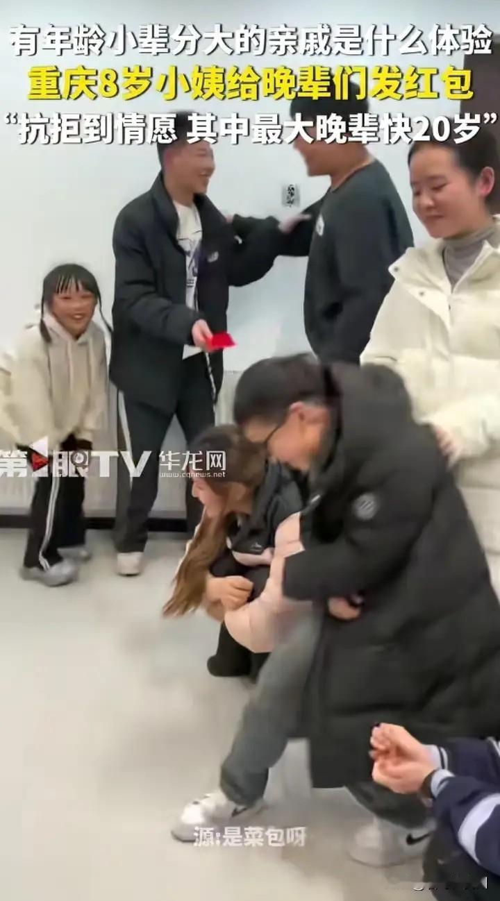 重庆8岁小姨发红包,晚辈跪着领!画面笑麻了 重庆新年这回真的杀疯了! 这两天全网都被一个8岁的小女孩硬控住了。不是因为她才艺多牛,而是因为她当!小!姨!了! 谁懂啊家人们,这边还在上小学二年级,寒假作业估计都没写完,那边反手就掏出一叠红包,给跪在地上的侄儿侄女们挨个发钱。关键是这群晚辈里,最大的那个侄儿都快20岁了,正是身强力壮的大学生啊! 就这体格,还得老老实实跪在8岁的小姨面前领红包,那画面,真的又好笑又温馨。 拍摄这段视频的杨女士说,这是家里的老传统了,辈分在这儿摆着,过年就得磕头领红包。刚开始的时候,场面其实一度非常尴尬。 你想啊,那几个十几岁的小年轻,平时在学校也是学长学姐的范儿,现在让他们对着一个扎着羊角辫、个头还没自己腰高的小姨下跪,谁迈得开腿啊?一个个站在那里扭捏得像根麻花,家长在旁边拉都拉不动,脸都憋红了。 结果你猜怎么着? 这种僵局往往只需要一个“社牛”就能打破。有个年纪稍小点的孩子,估计想着“早死早超生”,扑通一下就跪下去了。这一跪可好,后面的气氛组瞬间到位!剩下的几个晚辈一看有人带头,那还顾虑啥,赶紧跟风跪成一排,生怕跪慢了红包缩水。 前一秒还写满“抗拒”的脸,在接过小姨手里红包的那一刻,全员笑开花。 最逗的是那个8岁的小姨,手里攥着厚厚一叠红包,看着眼前这群比自己高出一大截的晚辈,表情又认真又懵懂,估计心里在想:“这届大人真难带,拿个红包还得我亲自发。” 其实仔细想想,这种所谓的“辈分压制”,真的就是咱们中国式家庭独有的浪漫。 以前总觉得这些老规矩是繁文缛节,但长大后才明白,正是这种看似“反常规”的仪式感,才把一家人牢牢地拴在了一起。 平时大家各忙各的,孩子在城里上学,大人在外地打工,也就是过年这几天,因为这种有点好笑的“跪拜”,大家才又找回了那种血浓于水的亲热劲儿。 不管你是8岁还是80岁,只要在这个家,辈分就给你拿捏得死死的。 红包里装的不只是钱,更是长辈对晚辈的祝福;那一跪跪的也不是形式,是咱们中国人骨子里的孝道和传承。 热热闹闹的,这才是新年该有的样子嘛! 🌟 最后想问问大伙儿: 你们家有没有那种“年龄小辈分大”的神奇亲戚?你被他/她喊过“侄子/侄女”吗? 快来评论区晒晒你们家的辈分名场面,让我看看谁家的反差最大!