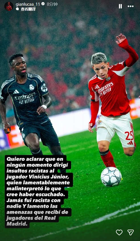 普雷斯蒂亚尼发文:我想澄清,我从未对球员维尼修斯·儒尼奥尔进行过任何种族歧视的侮辱,他很不幸地误解了他听到的内容。我从未对任何人有过种族歧视行为,我对收到的来自皇家马德里球员的威胁感到遗憾。