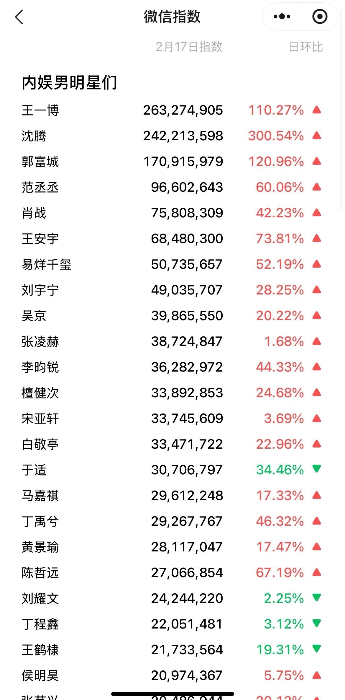 woc,王一博沈腾微指破2亿了,从微指改版后破亿就很难很难了,这绝对的新春断层大爆!!王一博微指破2.6亿,沈腾2.4亿,郭富城1.7亿!