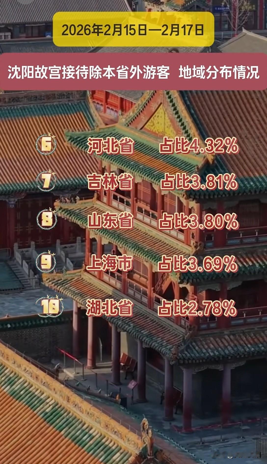 沈阳故宫游客数据曝光:江苏6.93%、浙江5.42%…沈阳,你能接住这波“南来北往”的热情吗? 故宫15-17日外省游客占比出炉:江苏6.93%领跑,浙江5.42%紧随,北京5.17%,广东5.15%,黑龙江4.86%挤进前五! 这组数据藏着什么玄机?长三角游客已成绝对主力,东北仅有黑龙江上榜——沈阳文旅人不禁自问:当南方游客大举北上寻找“诗与远方”时,我们准备好了吗? 好在沈阳的答卷已经亮出:春节旅游订单暴涨155%,远超全国平均!从奥体冰雪嘉年华到清河半岛无边泳池,从非遗糖人到AR历史复原,沈阳用“反差萌”狠狠拿捏了南方客的心。 更绝的是“听劝”服务:12345-9热线24小时在线,机场车站送福字借棉衣,网友直呼“太宠了”! 数据是方向,服务是王牌。沈阳正用冰雪温泉+暖心诚意,让“流量”变“留量”。下一个假期,你会把沈阳加入旅行清单吗?评论区聊聊👇 沈阳