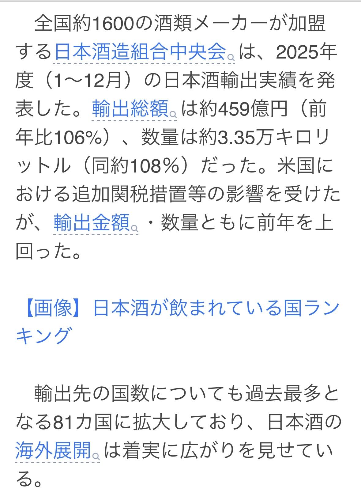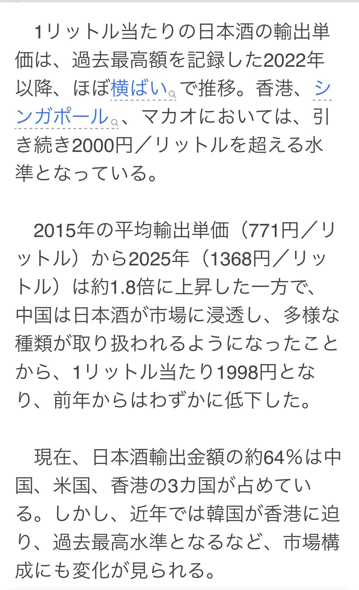 25年,日本酒出口81国,出口金额459亿日元,出口量3.35万千升。 出口金额第一位中国约133亿日元、6660千升。第二位美国约111亿日元、7720千升。第三位韩国约44亿日元、5483千升。 15年日本酒出口单价每升771日元,25年上升到每升1368日元。 日本酒64%销往中国、美国、香港,韩国随后。