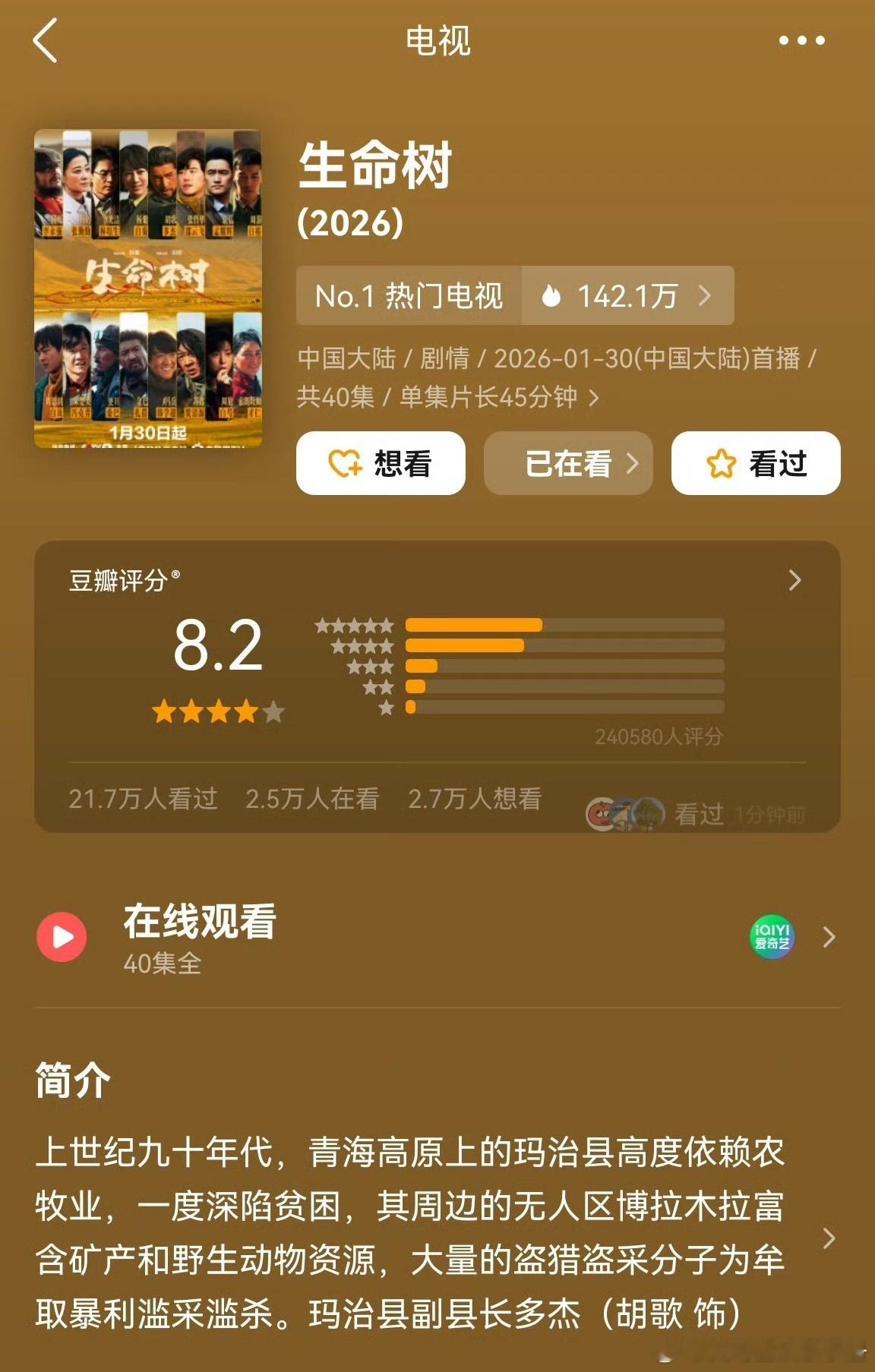杨紫《生命树》评分上涨至8.2分