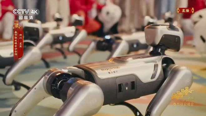 在宜宾分会场,上百台魔法原子四足机器人MagicDog穿戴熊猫外观,同步完成奔跑、列阵与舞蹈动作,在高密度调度场景中实现毫秒级同步,视觉效果尤为震撼。