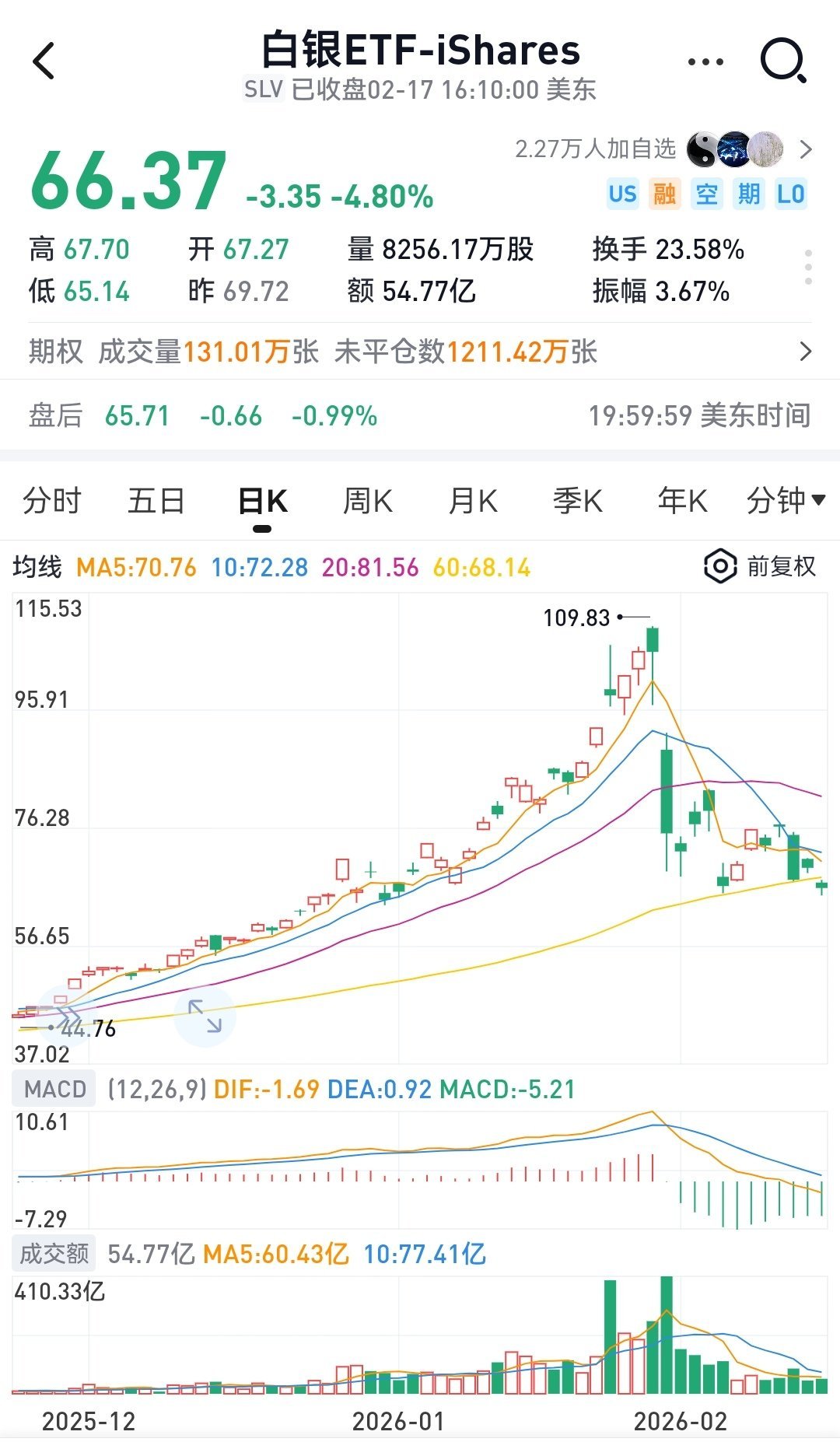 春节期间,黄金白银继续暴跌,很多投资者又要睡不着觉了,聚会期间讨论黄金白银的人也少了不少,白银在短短半个月期间已经腰斩,这就是爆炒的结果,跟风追涨者只会站岗,所谓趋势周期都是忽悠韮菜接盘的话术,说变就变,而那些忽悠高位吹捧的大V们都删帖躲起来不说话了,任何炒高脱离基本面的投资标的都会以暴跌结束,投资者们千万不要贪心眼红。最后,我现在空仓。黄金黄金白银暴跌投资$白银ETF-iShares SLV$ $黄金ETF-iShares IAU$