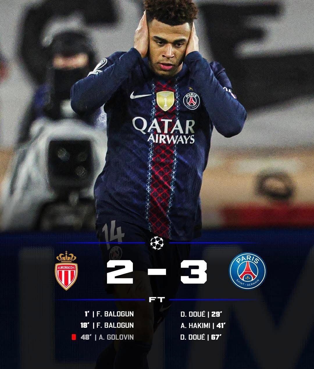 欧冠联赛摩纳哥2比3巴黎圣日耳曼欧冠附加赛首回合上演惊天逆转!摩纳哥主场开局梦幻,巴洛贡短短时间内梅开二度,早早 2-0 领先巴黎圣日耳曼。危急时刻,替补登场的杜埃站了出来,先是破门缩小差距,随后助攻阿什拉夫补射扳平,半场战成 2-2。下半场戈洛温恶意犯规染红,摩纳哥少打一人陷入被动。第 67 分钟,杜埃再入一球完成梅开二度,帮助巴黎 3-2 反超比分。全场跌宕起伏,巴黎客场让二追三拿下首回合,手握晋级主动权,次回合移师王子公园球场再战。