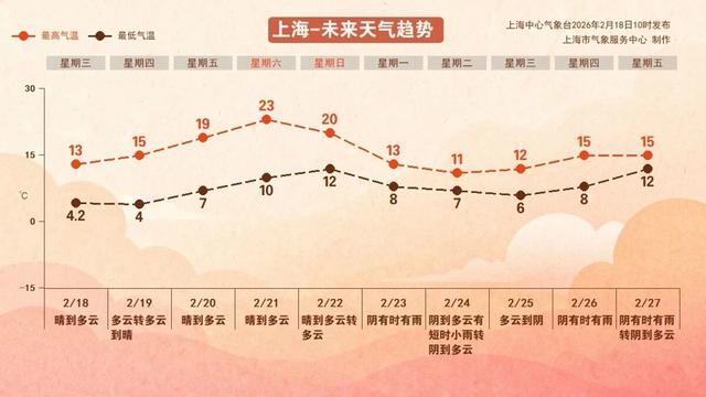未来三天,本市受高空西北气流控制,以晴到多云为主,气温逐日回升。初三早晨气温仍较低,市区最低4℃,部分郊区仍在冰点以下;初五、初六最低气温将重回10℃以上,初五达到回暖顶峰,最高气温可达23℃,体感温暖如春。回暖之后冷空气已“预订”。初七前后,受新一股冷空气影响,本市将迎来大风、降温和降雨天气,正值返程高峰,提醒市民密切关注最新预报,提前规划行程。