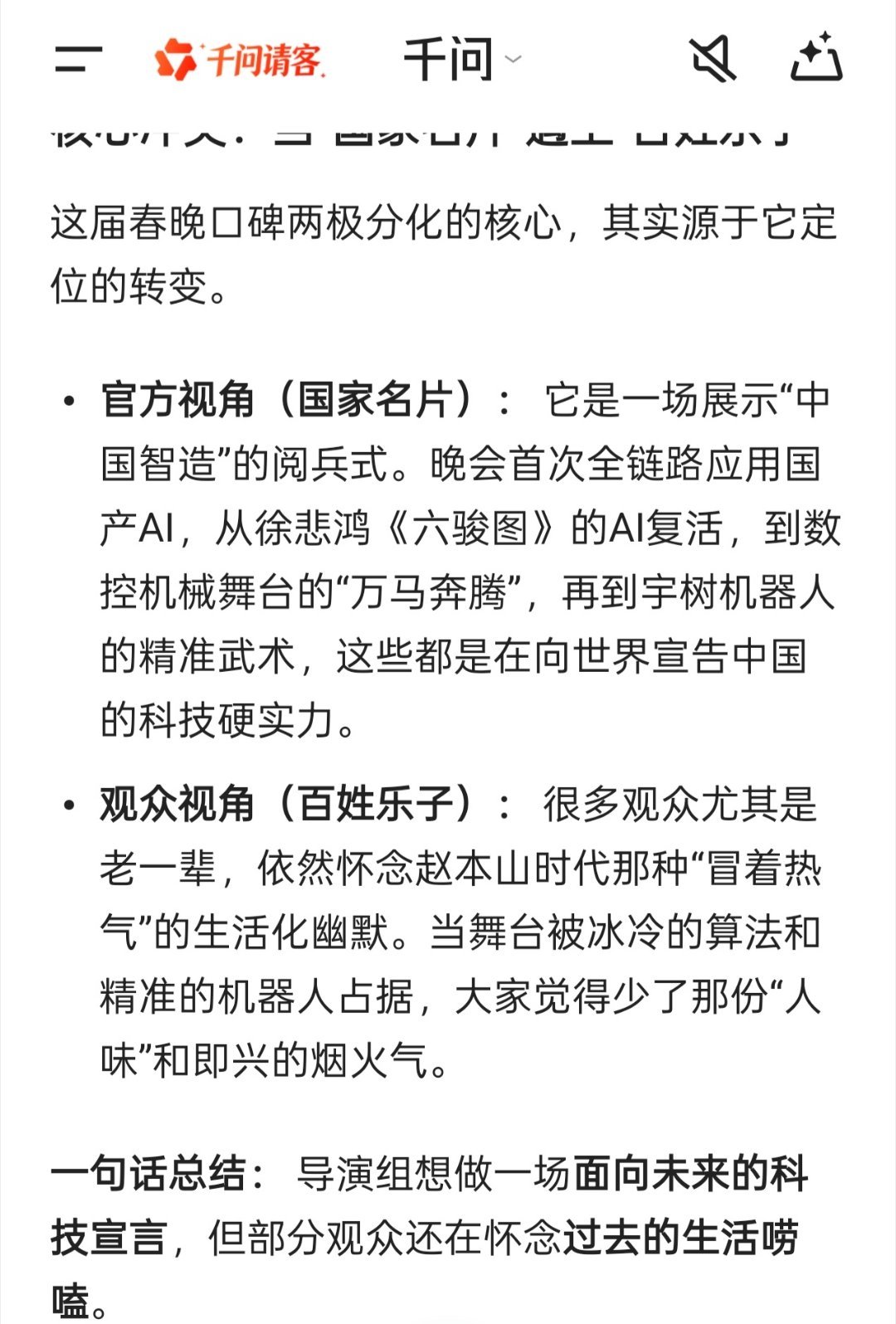 我AI聊春晚2026年的央视春晚已经落下帷幕,这届以“骐骥驰骋 势不可挡”为主题的晚会,是一场技术与艺术、传统与未来激烈碰撞的盛宴,同时也伴随着不小的争议。这届春晚最大的特点是“科技+国风”。虽然视觉效果满分,但很多观众都觉得这届春晚在“好笑”这件事上做得不够:“人味”变淡,机器 今年春晚大量使用机器人,甚至在小品和武术中担任主角。虽然展示了科技实力,但不少观众觉得“以前缺年味,现在缺人味”,冰冷的机器虽然精准,但少了些烟火气。