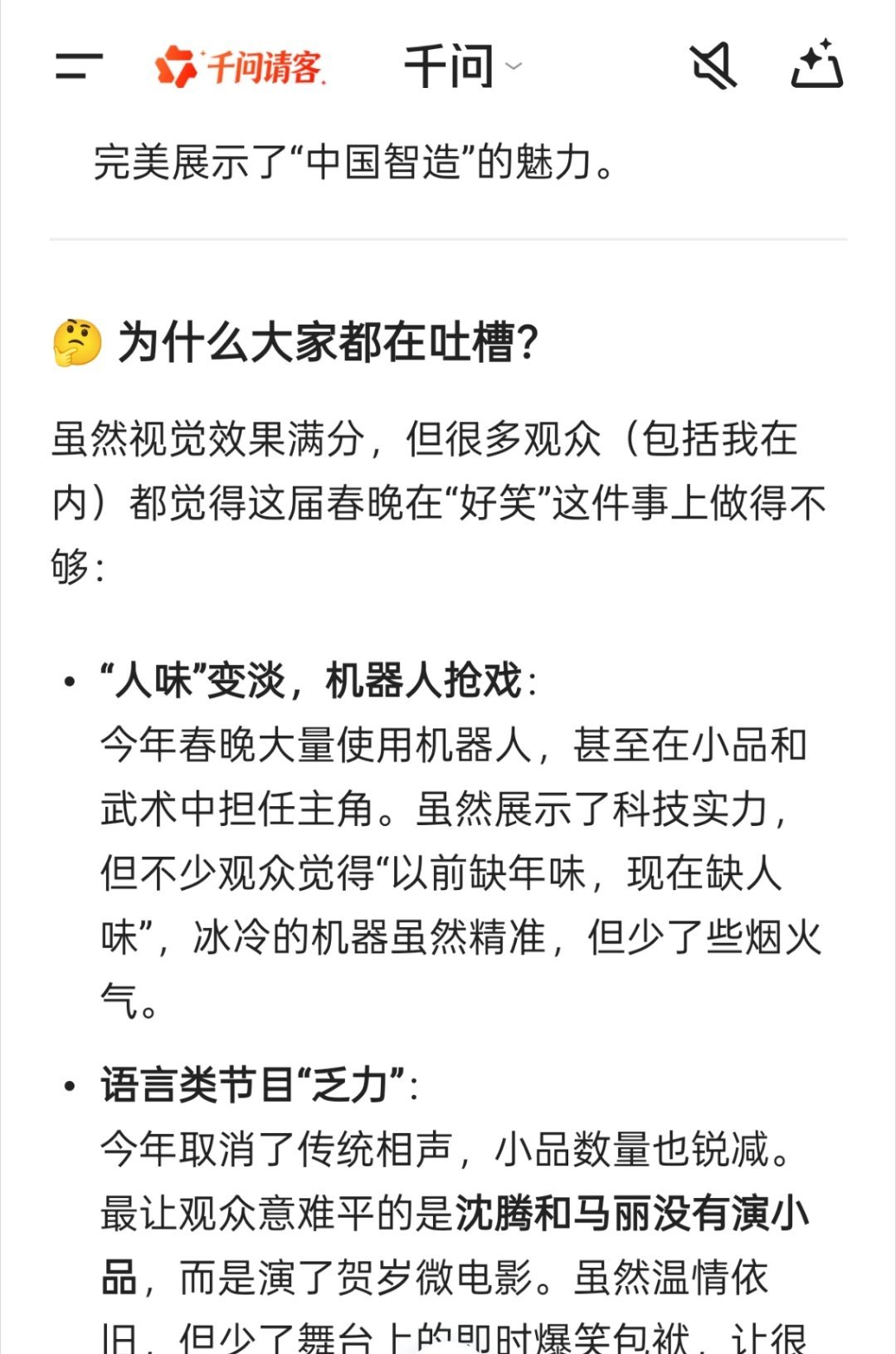 语言类节目“乏力”:今年取消了传统相声,小品数量也锐减。最让观众意难平的是沈腾和马丽没有演小品,而是演了贺岁微电影。虽然温情依旧,但少了舞台上的即时爆笑包袱,让很多人觉得“不过瘾”。是一场安全的、技术过硬的、视觉华丽的晚会,它成功地展示了国家形象和科技实力。但作为一台合家欢的节目,它在回归生活、回归普通人情感上还有提升空间。部分文字来源