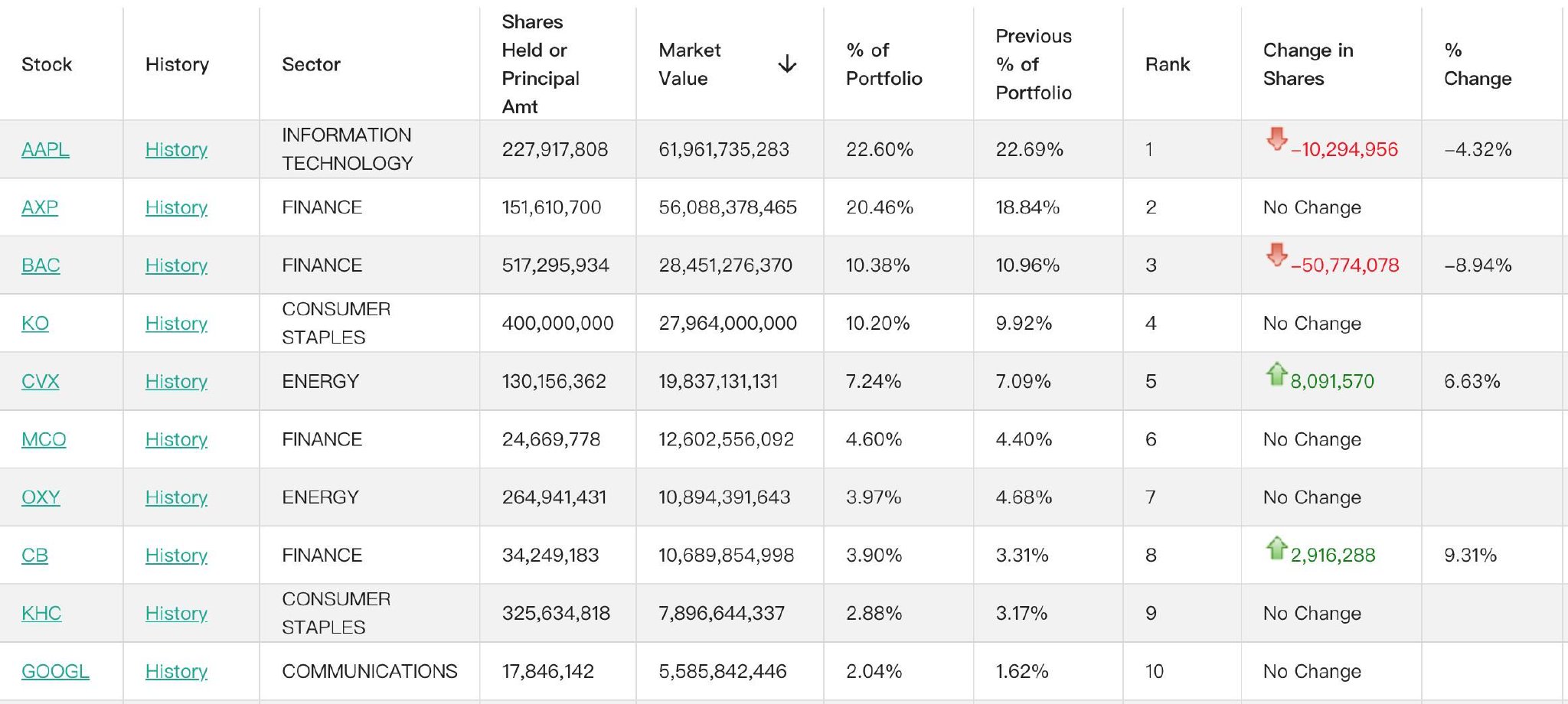 雪佛龙(CVX.US)位列第五,持仓约1.3亿股,持仓市值约为198亿美元,占投资组合比例为7.24%,较上季度的持仓数量增加6.63%。