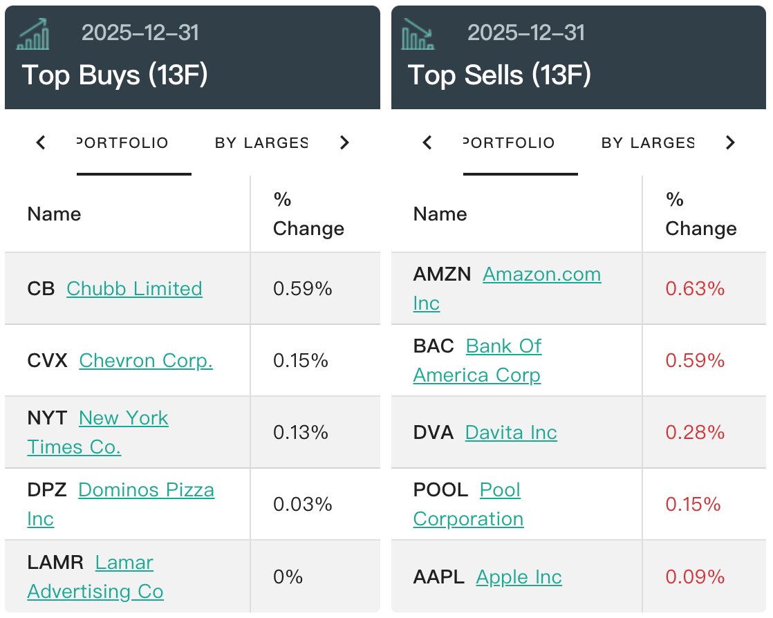 从持仓比例变化来看,前五大买入标的分别是:安达保险、雪佛龙、纽约时报、达美乐披萨(DPZ.US)、拉马尔户外广告(LAMR.US)。