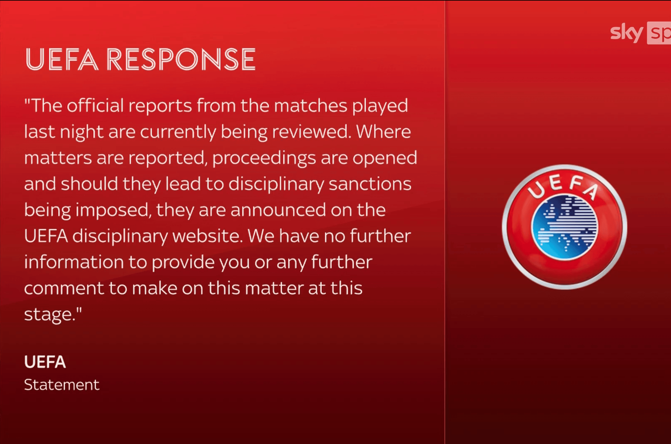 昨晚赛事的官方报告正处于审核阶段。如发现违规问题,将启动相关程序;若最终作出纪律处罚,相关结果将在欧足联纪律委员会官网公布。目前,我们暂不提供更多信息,也不就此事发表进一步评论。