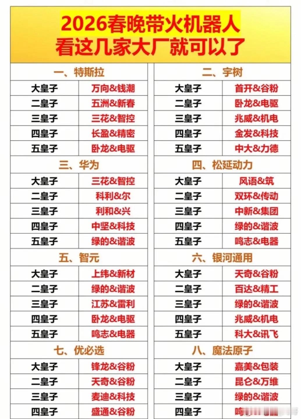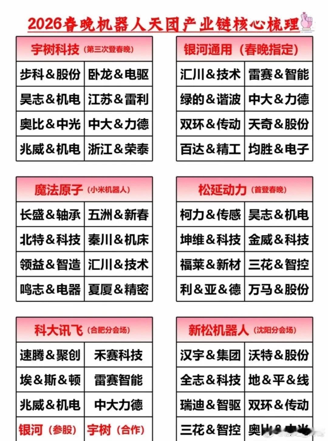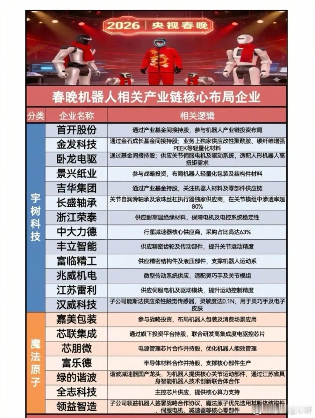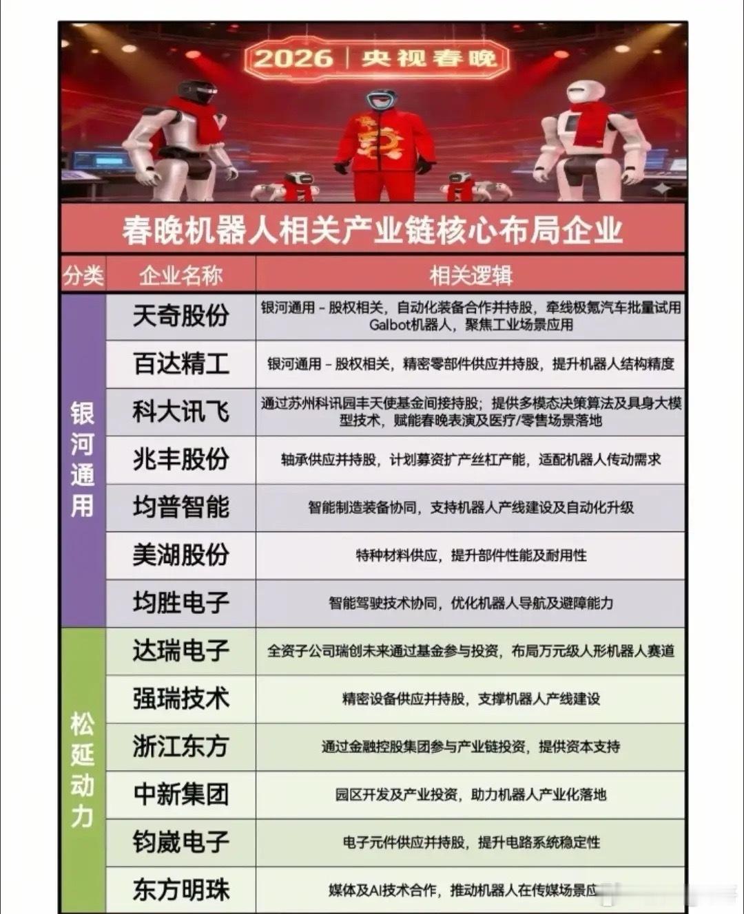 宇树科技春晚“三朝元老”、银河通用成立仅2年的“春晚指定”合作伙伴、魔法原子小米旗下的“行业黑马”、松延动力主打高爆发力的人形机器人动作表演……~相关概念龙头代表名单见配图。