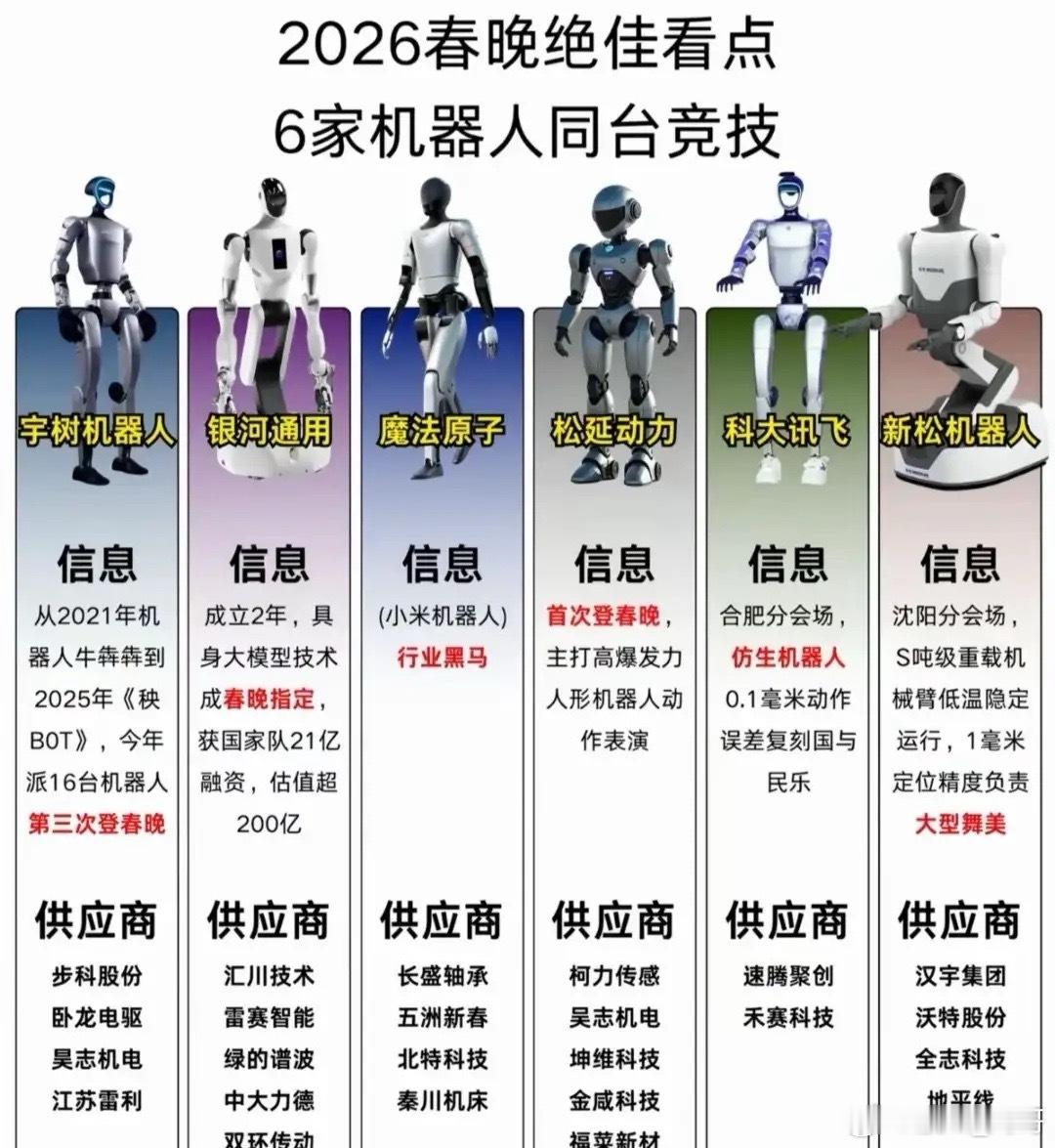 2026春晚科技感拉满!宇树科技、银河通用、魔法原子等6家机器人同台竞技,各展硬核实力。哪家公司会成为节后主线?相关概念龙头有哪些?