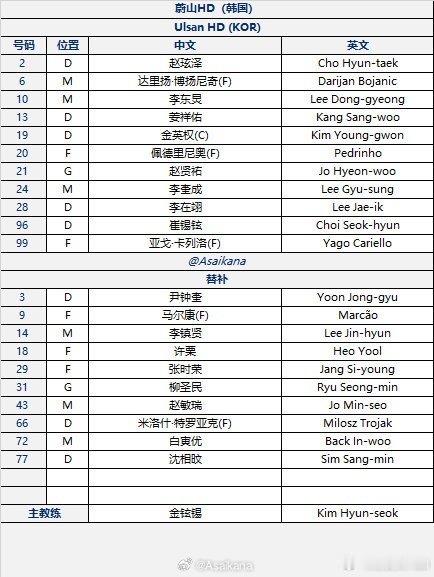 2025-26赛季亚冠精英联赛 联赛阶段 上海海港vs蔚山HD 首发名单