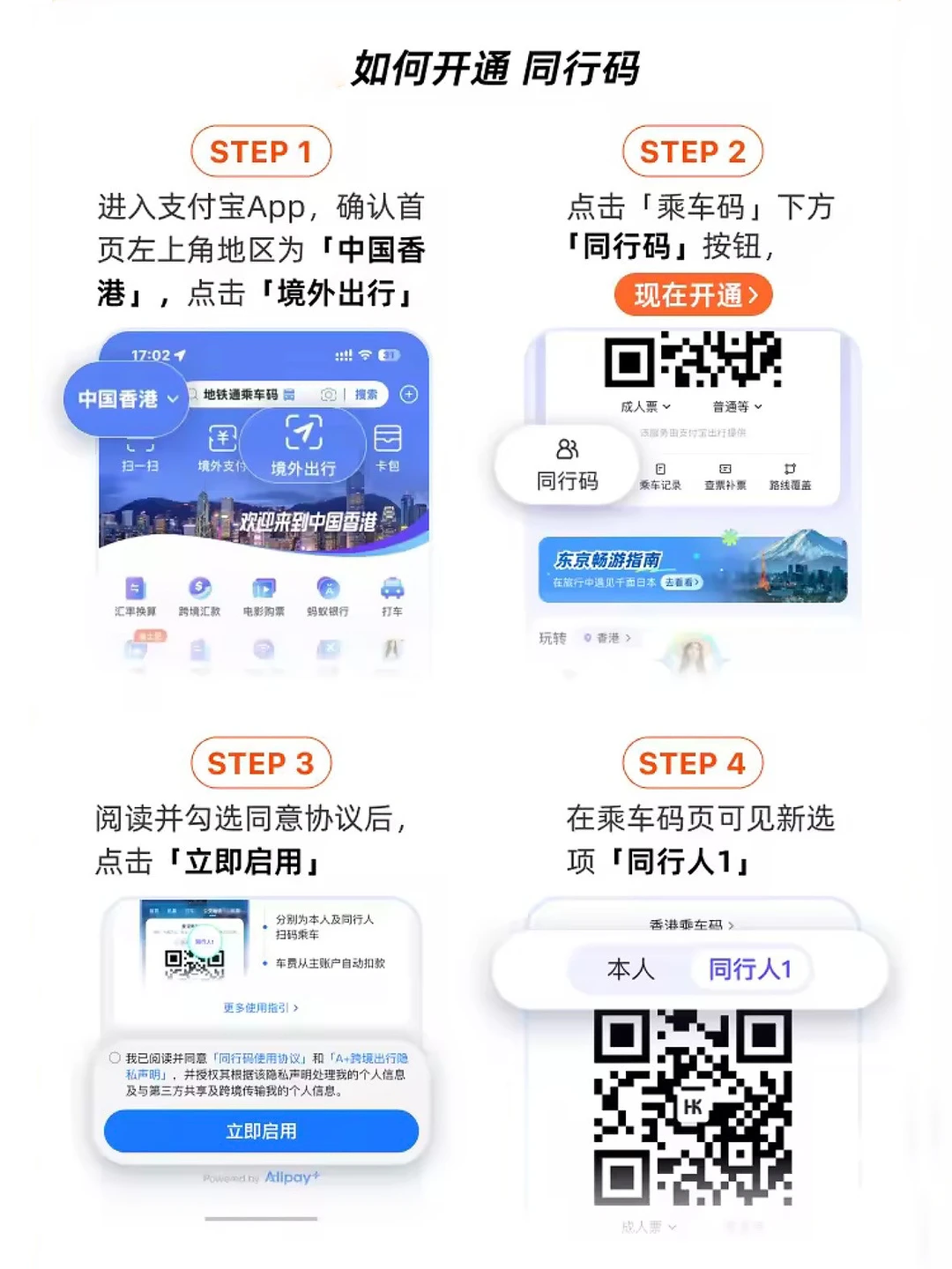 我建议大家可以提前在支付宝开通同行码功能,这样一部手机就能搞定3人刷码过闸,省时省力。进入支付宝切换地区为中国香港,点击境外出行,选择乘车码里的同行码,再点击“立即开通”就好了。而且现在还能领取新春限定的香港券包,刷同行码也可以用券。