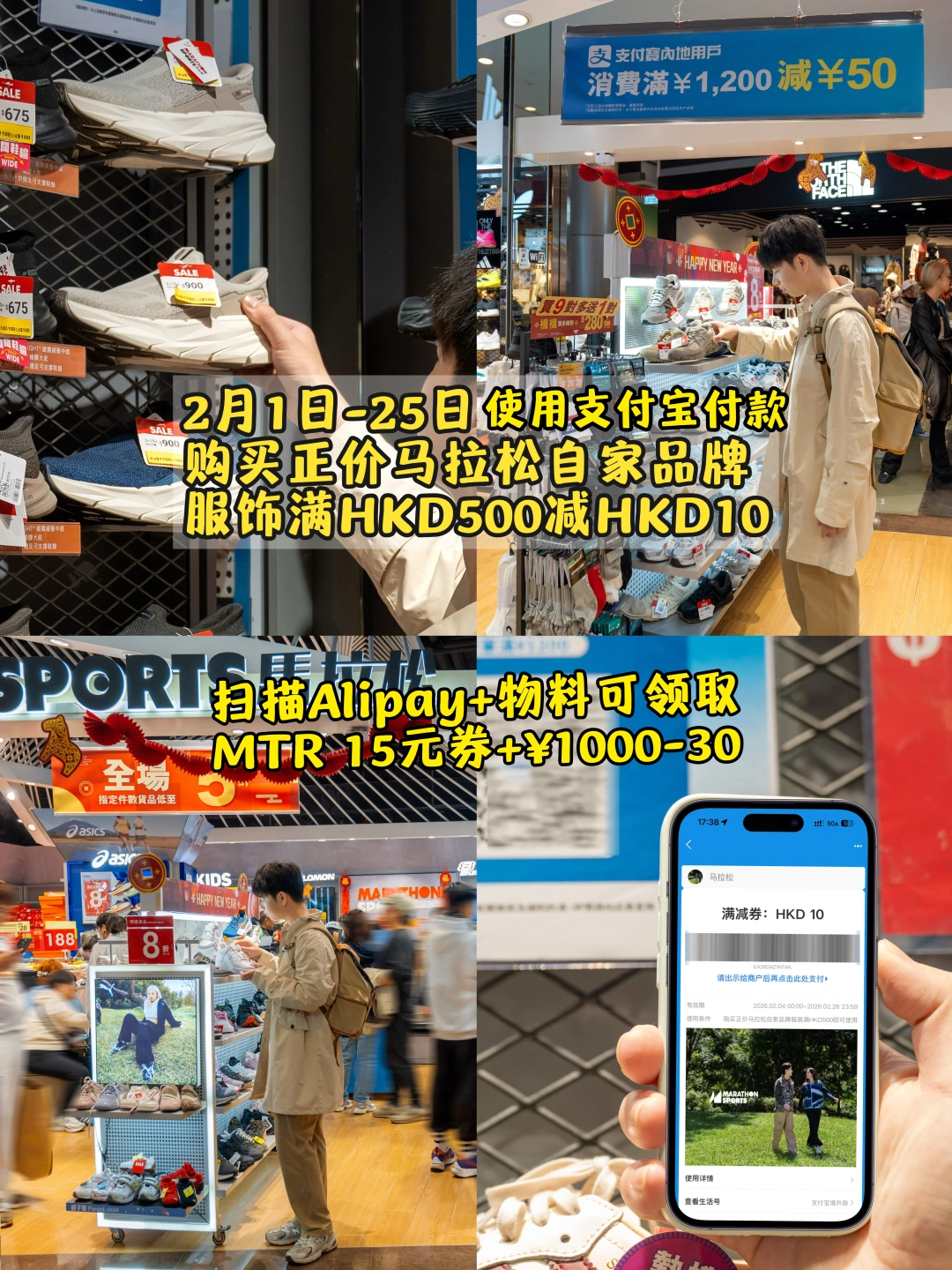 对于免税区的香港肯定少不了购物,旺角的马拉松非常适合购入新装备,买鞋更是超划算。春节期间用支付宝付款,还可以享受马拉松自家品牌服装满HKD500减HKD10的优惠,喜欢户外的朋友可以多多留意。付款买单后还能参加出境玩家大集结活动,有机会抽中马拉松的万元免单大奖哦~