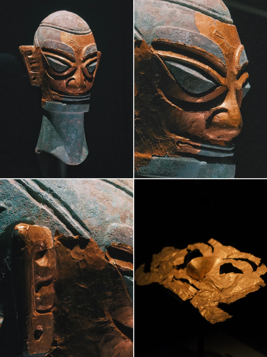 ▪️戴金面罩青铜人头像:整个三星堆,只有4件青铜器戴有黄金面具