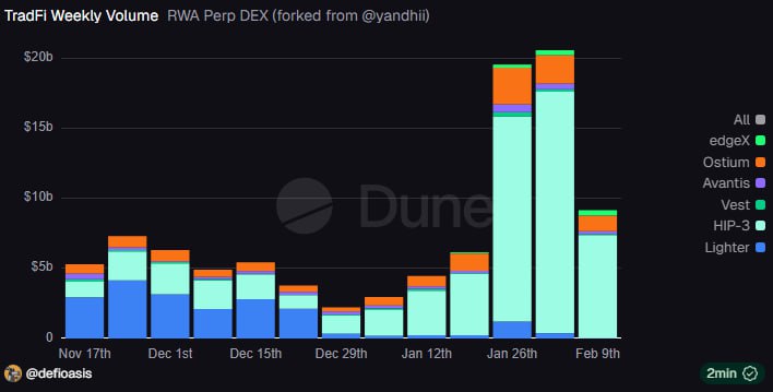 吴说获悉,据@defioasis数据,RWAPerpDEX的TradFi周交易量腰斩,其中占据主要市场份额的HyperliquidHIP-3的TradFi周交易量从172.1亿美元腰斩至73.3亿美元,下降近100亿美元。HIP-3提供商包括tradexyz、Dreamcash、hyENA、Markets、Felix和Ventuals,其中约80%的交易量集中在tradexyz。