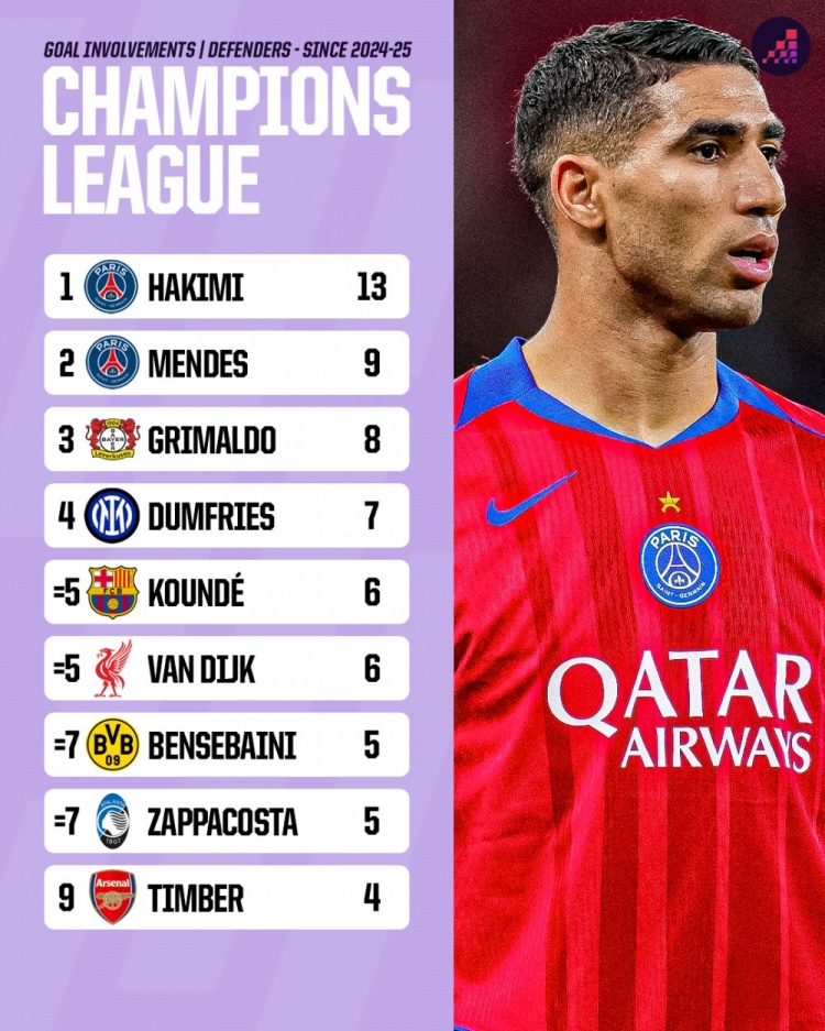 直播吧2月18日讯Opta统计了近两个赛季后卫在欧冠比赛中参与进球的数量,并列出榜单,阿什拉夫参与13球居首。