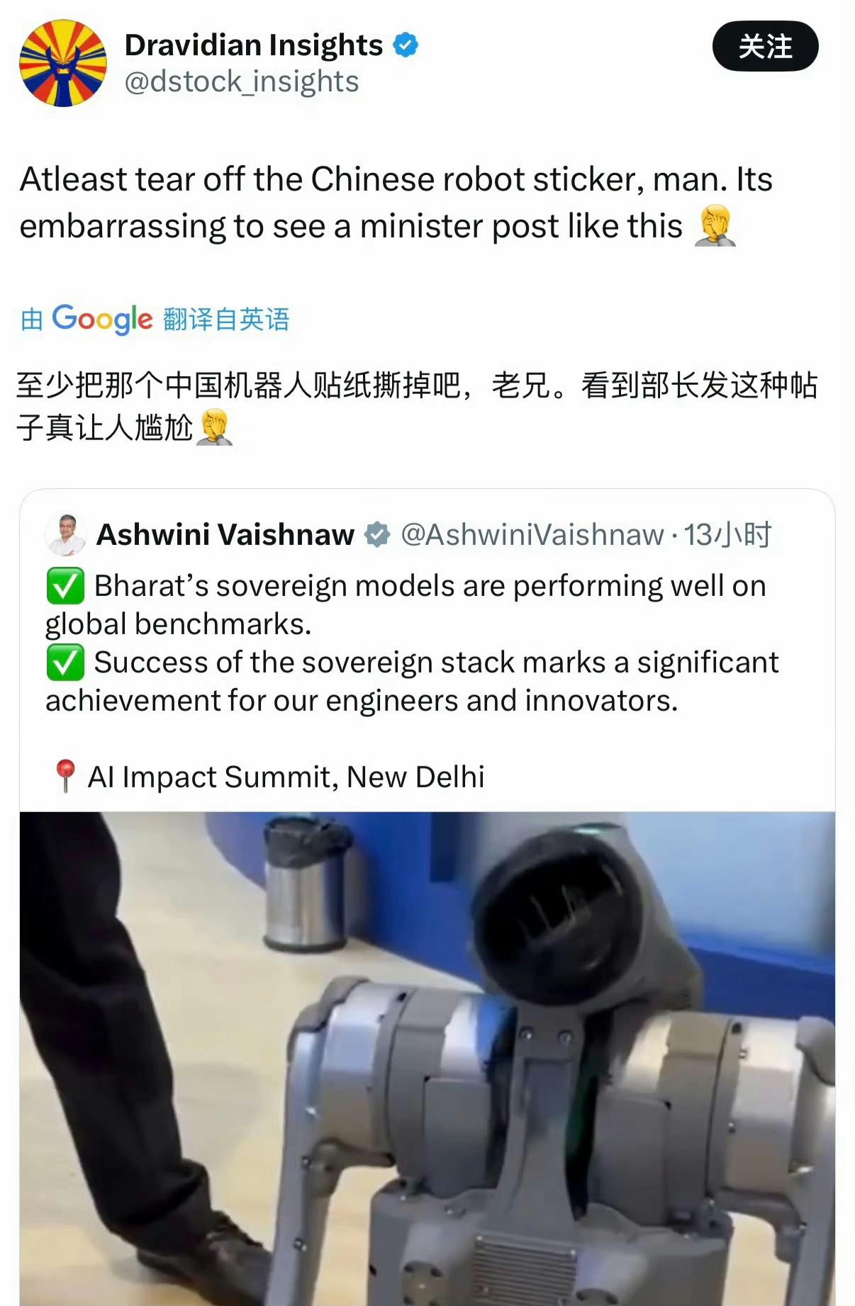 笑岔气了,德里科技部部长发了一段印度人工智能峰会的宣传片,宇树机器狗打头阵,X给备注“部长将中国机器人当作印度机器人进行展示” 印度人愤怒了