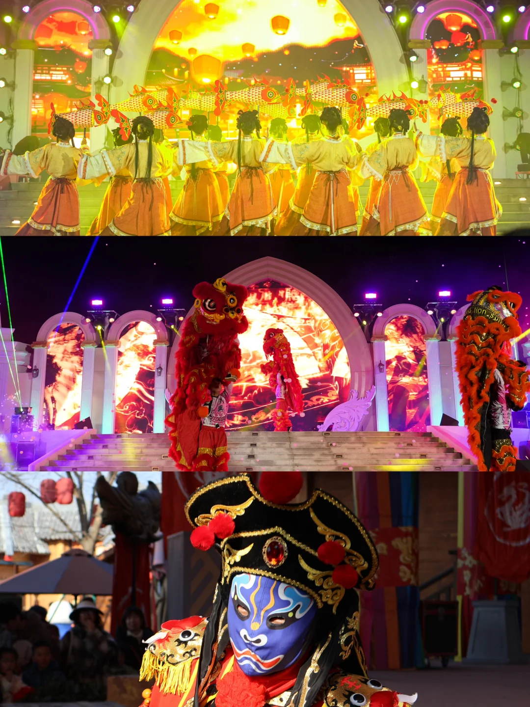 热血英歌舞、非遗火焰秀、舞狮、国潮花灯等经典民俗表演🎭,晚上还有各种演出和烟花秀[烟花R]
