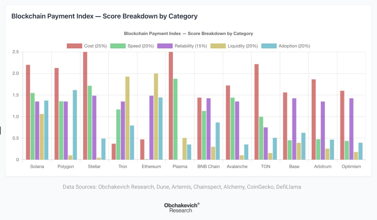 吴说获悉,据支付数据科学家Alex,根据P2P转账、汇款、商户支付以及金融科技基础设施评估区块链的支付指数,其中Solana排名第一,相对最为均衡,但主要弱点是稳定币的流动性落后于Ethereum和Tron;Polygon排名第二,成本、速度和可靠性表现出色,采用率最高,但最大的问题是稳定币流动性较低;Stellar排名第三,在跨境转账和汇款表现出色,但稳定币生态规模较低,稳定币供应量仅为20亿美元;Tron排名第四,其在稳定币的交易量上占据主导地位,特别是在大额和跨境流动中,但小额零售支付受限于费用结构;Ethereum排名第五,持有全球稳定币供应量的55%,但支付用户体验在底层中存在缺陷,不适合日常支付。