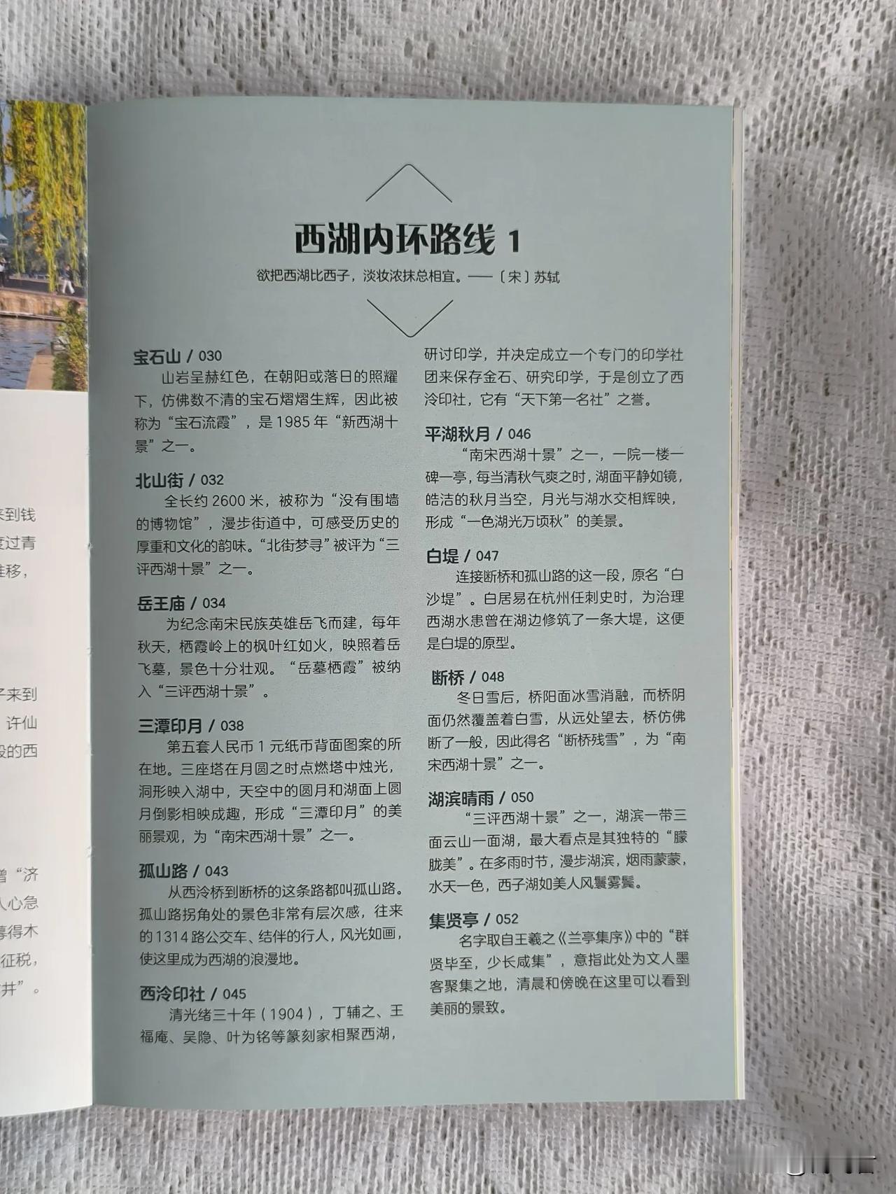 一本书游遍杭州30景,攻略也太详细了 俗话说:“上有天堂,下有苏杭”,杭州每到节假日都人满为患,这个家喻户晓的地方,谁说没去过杭州西湖呢?哪怕去过也还想去! 其实,我去杭州也多次,西湖周边景区也去不少了,但至今都觉得没转明白,总想好好逛个明白。 好在,快要春节假期,旅游旺季前,我阅读了一本郁青云编著的《杭州诗意人文地图》,这本书拿到就觉得太实用了,一本书在手,都不用做攻略了,图文并茂,包括游玩的景点、逛吃、住宿、交通等,几乎都全了,非常详细。 杭州如此有名气,除了名人白居易、苏轼外,更有白娘子与许仙的爱情传说,还有西湖龙井好茶,西湖景区等等! 说到西湖景区,面积约60平方公里,有著名的西湖十景、后又被评选出新西湖十景、三评西湖十景,所以游遍玩西湖景区,共有30个景点,随便逛逛至少花上2-5天吧! 如果是休闲游慢步行走逛西湖,可以逛一下书中建议的西湖内环路线1,全程5-6小时,从宝石山、北山街、岳王庙一路环线走到集贤亭。 这条线路不仅有岳飞庙;有1元人民币背面图案的“三潭印月”;也有白娘子与许仙相会处的“情定断桥”;更有唐朝诗人白居易治理西湖所修筑的白堤等。 逛完内环线1,可以继续逛内环路线2,从苏堤到钱王祠,这条路线的全程也需要约走5-6小时。 当然,如果你觉得走着太累,可以全程骑自行车、或环湖坐船、或招手叫仿古车。 这条路的特色,我觉得特别适合春天去走,因为曲院风荷里有很多樱花,盛开时特别美。当然,如果是我,很想去看看钱王祠,怎么说也是同姓。 走完前面二条,书中还推荐了内环路线3,这条路从花港观鱼到长桥公园,里面有太子湾公园,还有雷峰塔,路程需要4-5小时,有些路线也可以坐船,有些路还得登山+下山,有点消耗体力,如果肚子饿了,可以去净慈寺吃素食。 逛完这3条内线基本也花去2天时间了,西湖的景点当然不止这些,别急着几天想逛完,可以分一年四季逛!每一季都有不同的特色。 比如还可以去灵隐寺、南宋御街、河坊街、博物馆、图书馆、浙大校区,还有离杭州周边的西溪景区、京杭大运河,以及夜景、特色美食小吃等。 交通也非常方便、有公交、地铁、水上巴士、可骑车,体验休闲的美好乐趣,这本书真的比导游还贴心,想去杭州的朋友,不妨带上这本书去旅游吧! 杭州旅行风光 杭州游玩线路 杭州玩乐地图