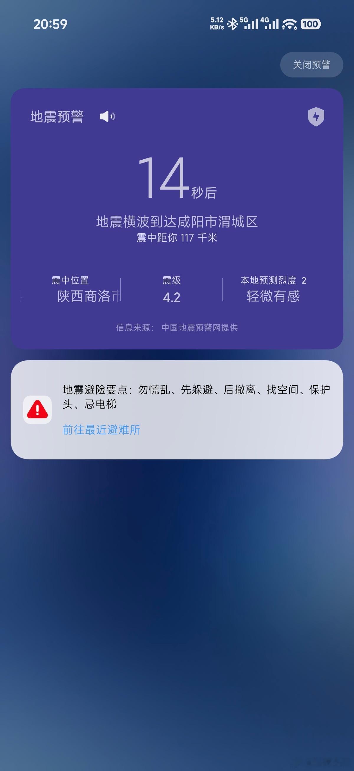 正边吃零食边看电视呢,我的小米手机和妍总的华为平板都收到地震预警,离我这边还真蛮近的,4.2级在商洛,我这边楼层低倒是没啥感觉,就是养的乌龟好像突然躁动了一些。这大过年的,商洛的大家要平安呐!